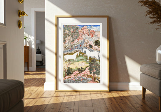 Immerse your space in the rich tradition of Persian art, where history, mythology, and beauty converge. Featuring intricate miniature paintings inspired by legends from the Shahnama of Ferdowsi, the vivid works of Sultan Muhammad, and the delicate artistry of Manohar, these prints celebrate classic Iranian tales and the masterful techniques of artists like Mir Sayyid. Each piece is a window into the timeless elegance and storytelling power of Persian culture.