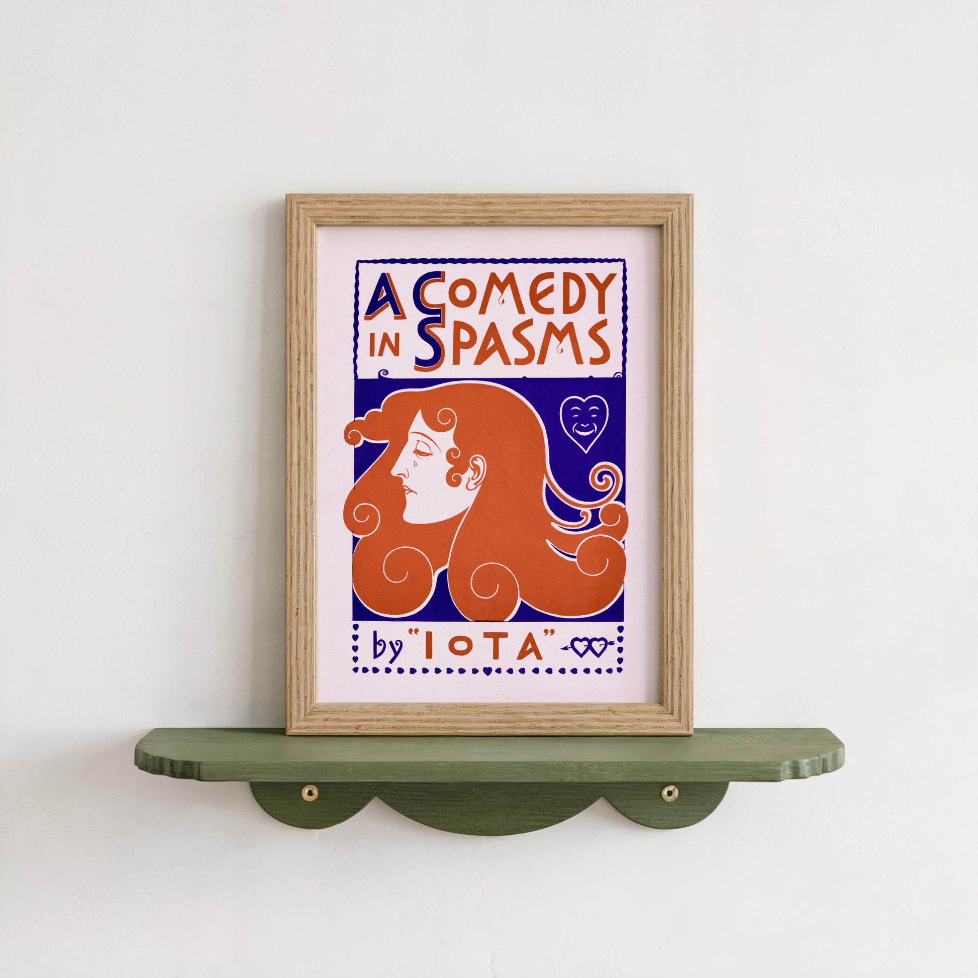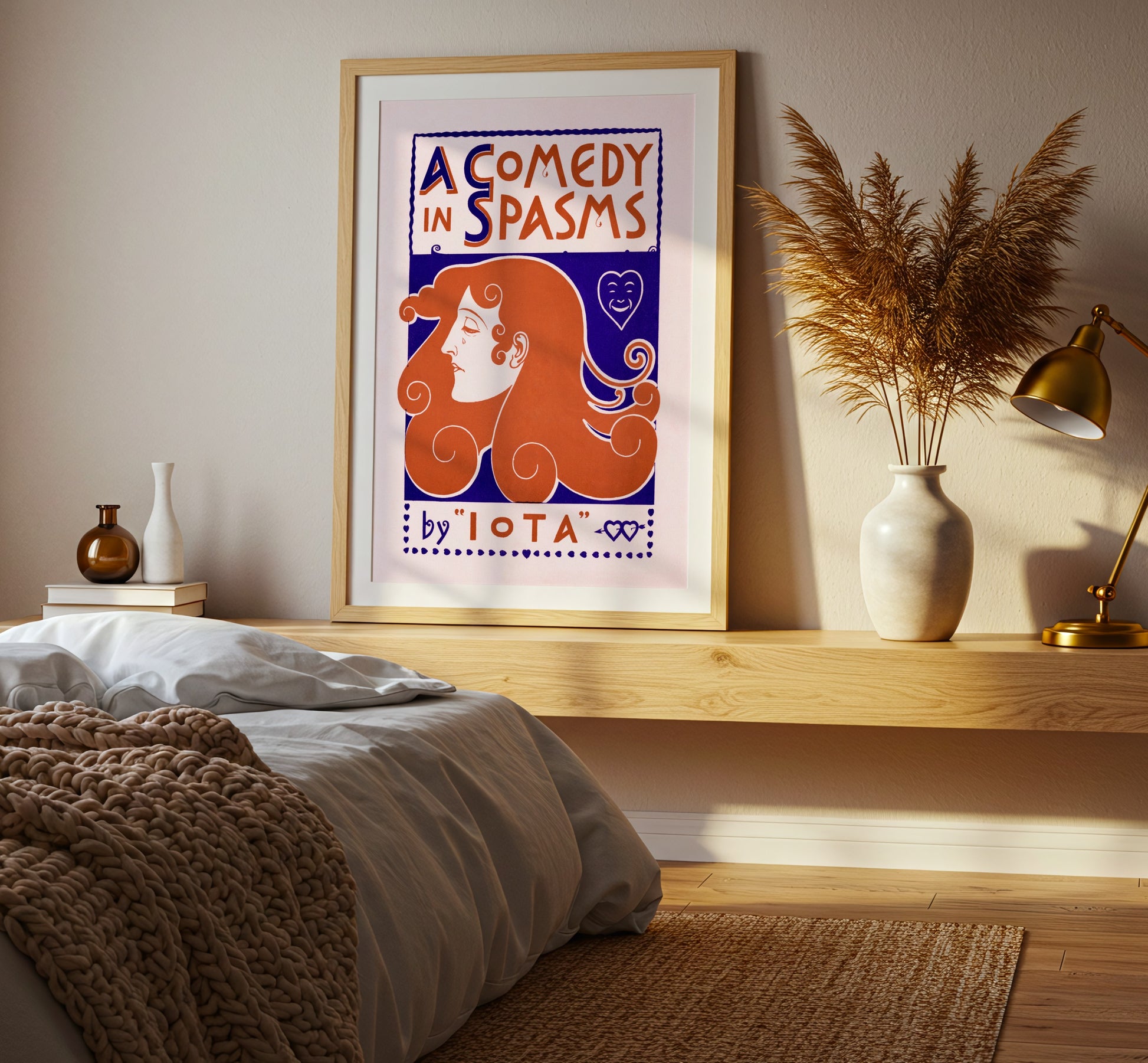 Add a burst of charm and wit to your space with A Comedy in Spasms by “Iota,” a vibrant piece of vintage advertising and feminist art. This colorful poster art blends whimsical graphic design with elegant Art Nouveau elements, making it a standout in any collection of decorative art or historical posters. Perfect for fans of literary posters and antique illustration, it captures the playful spirit of early comedy art with a bold, feminine twist.