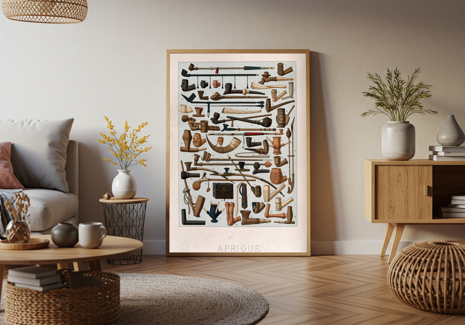 Immerse yourself in the captivating world of African craftsmanship with African Pipes Chromolithograph by Schmidt, where a stunning array of pipes and ceremonial instruments are meticulously arranged in a harmonious composition. This print showcases detailed textures and rich tones, reflecting the intricate artistry that characterizes traditional African pipes. The orderly presentation offers both a visual feast and an exploration of cultural significance, inviting viewers to appreciate the diversity and history encapsulated in these unique objects. The mood is one of reverence and curiosity, bridging the past and present through Schmidt’s artistic lens.