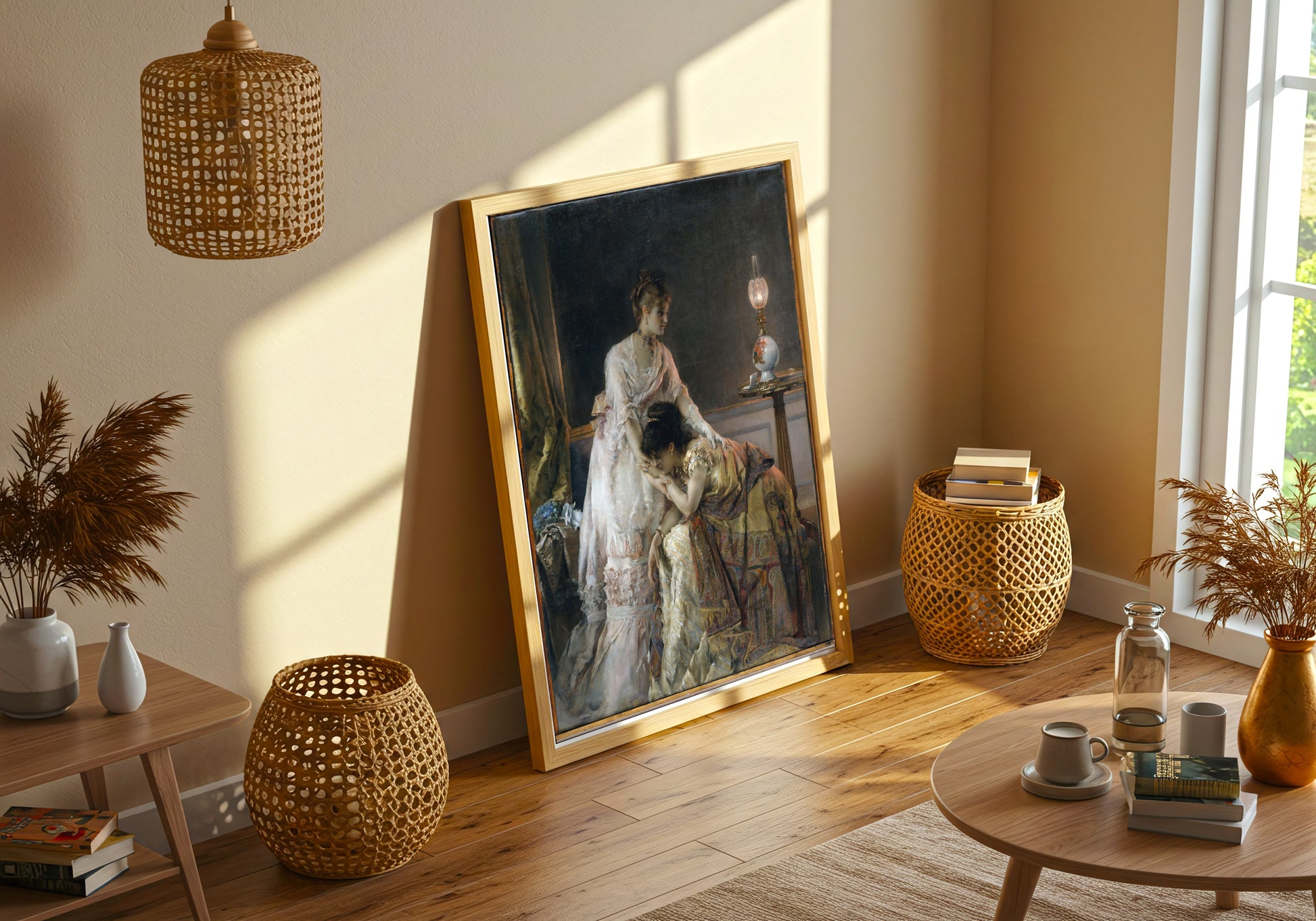 In "After the Ball," Alfred Stevens masterfully captures a tender moment of intimacy and reflection, enveloping the viewer in the delicate emotions that linger after a grand event. The soft, ethereal light bathes the two elegantly dressed women, instilling a sense of nostalgia and vulnerability. The contrast between their sumptuous garments and the shadowy backdrop heightens the emotional gravity of the scene, inviting contemplation of their unspoken thoughts. As a celebrated figure of the 19th-century Academic movement, Stevens's exquisite attention to detail and vibrant color palette breathe life into this exquisite tableau, making it an evocative piece that resonates with artistry and emotion.