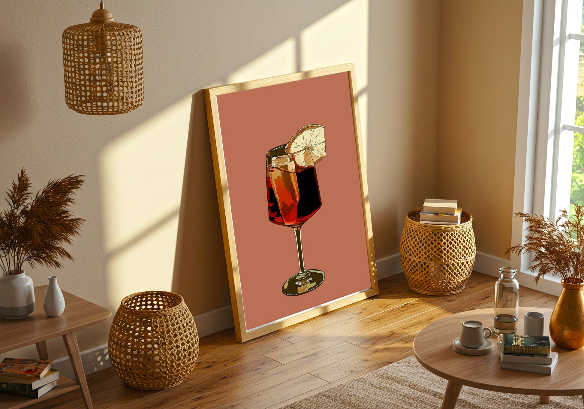Experience the vibrant allure of the Aperol Spritz, an artful representation that captures the essence of summer refreshment and conviviality. The bold hues of red and amber intersect beautifully within the glass, creating a striking contrast against the warm, terra-cotta background. The delicately sliced lemon garnish imparts a touch of sophistication, suggesting an invitation to relax and enjoy leisurely moments with friends. This piece transcends mere illustration, enveloping viewers in a sensory experience that evokes feelings of joy and warmth, reminiscent of alfresco dining under the golden sun.