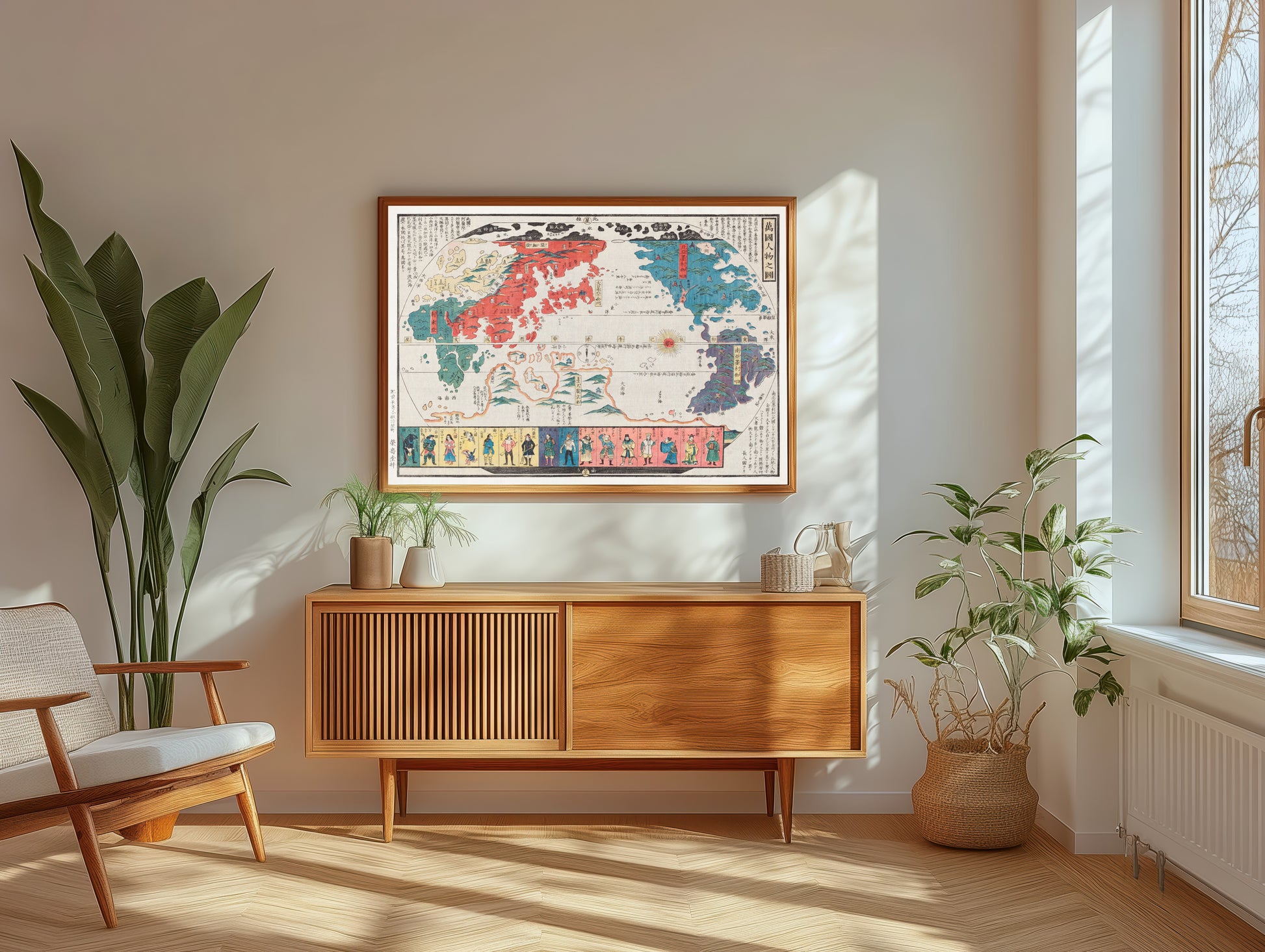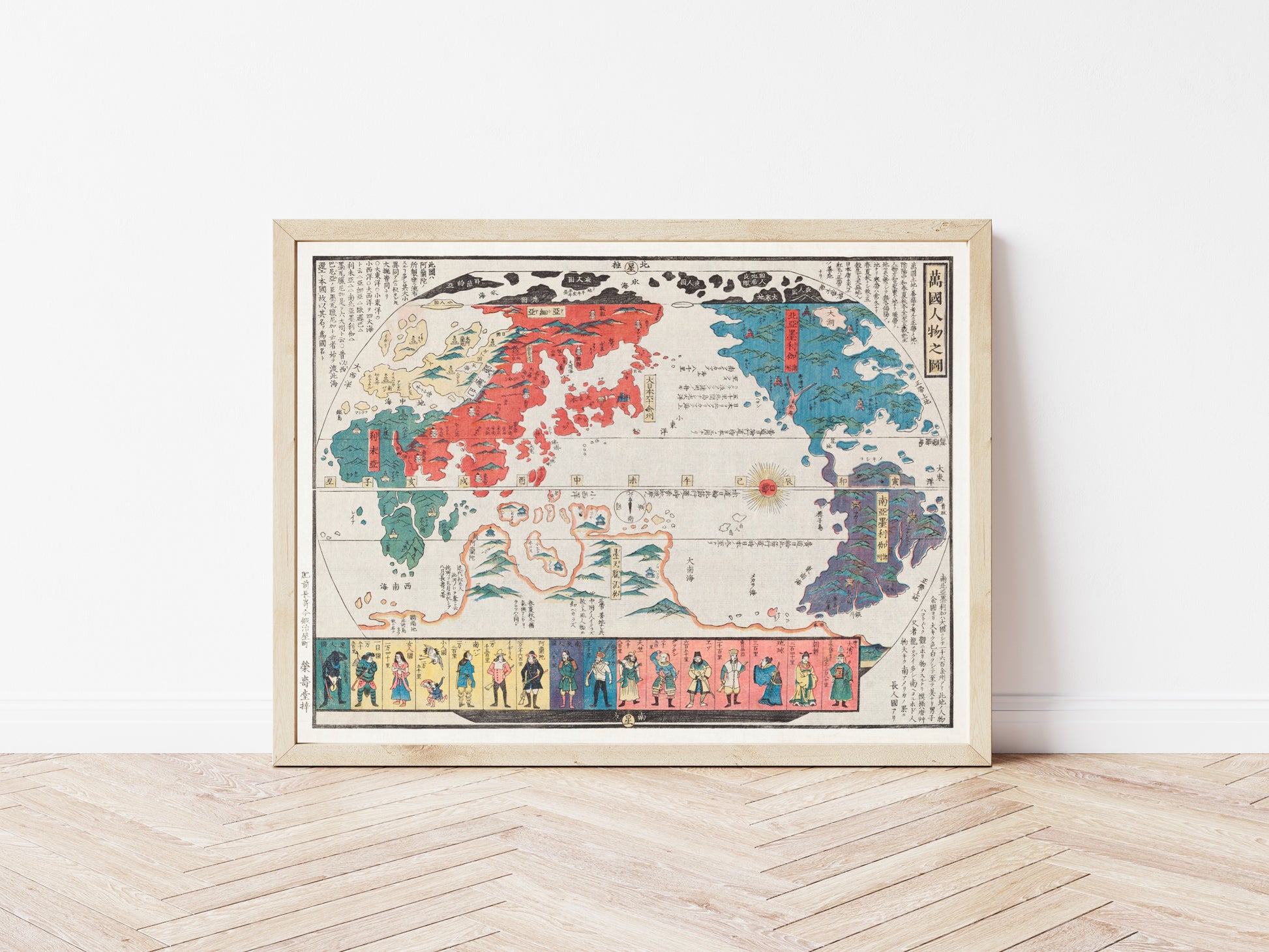 Delve into the rich cultural tapestry of Japan with Bankoku Jinbutsu no Dzu by Imakajiyamachi Eijudo, a captivating map that transcends mere cartography to become a work of art. The vibrant colors and intricate illustrations draw the viewer into a world where geography and human representation intertwine, reflecting the diversity of the nation. The topographical features are juxtaposed with allegorical figures, each symbolizing regional characteristics and traditions, creating a whimsical yet informative visual narrative. As a notable example of 19th-century Japanese ukiyo-e prints, this piece encapsulates the beauty of Edo-period aesthetics and storytelling. A perfect conversation starter, it brings history and artistry into your space.