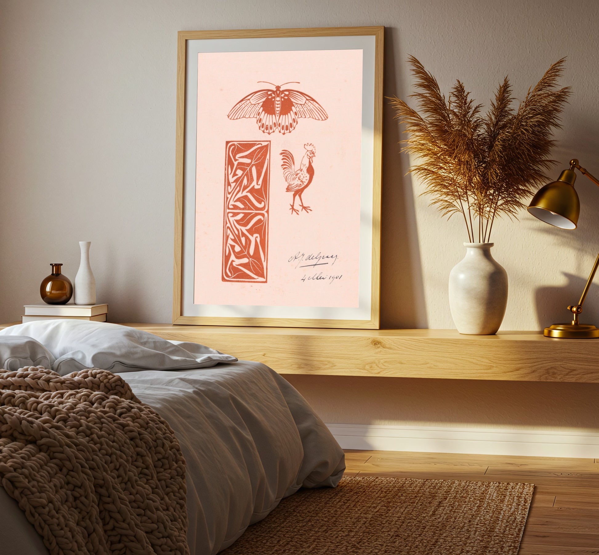 Experience the whimsical charm of Butterfly Rooster and Leaf Ornament by Julie de Graag, where nature and artistry beautifully intertwine. This captivating piece features delicate motifs of a butterfly, a rooster, and elegant leaf patterns, rendered in warm reddish tones against a soft pastel background. The harmonious composition evokes a sense of playfulness and serene beauty, characteristic of early 20th-century design. De Graag's mastery of line and form imbues this artwork with both style and emotional depth, making it a striking statement for any art lover. Ideal for those who appreciate the elegant simplicity and rich symbolism inherent in nature-inspired art, this print is a timeless addition to any collection.