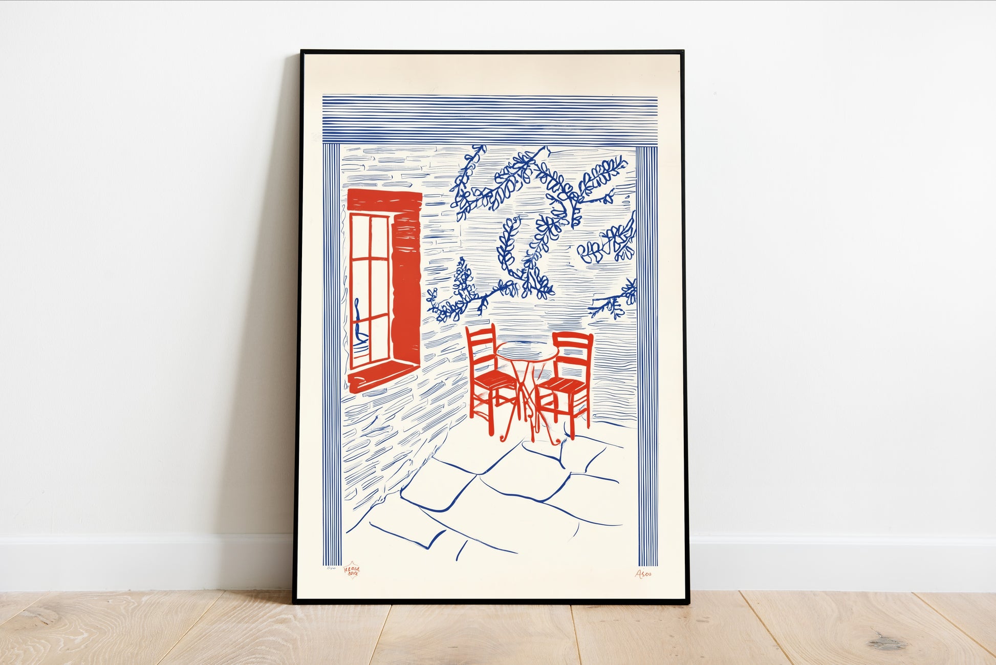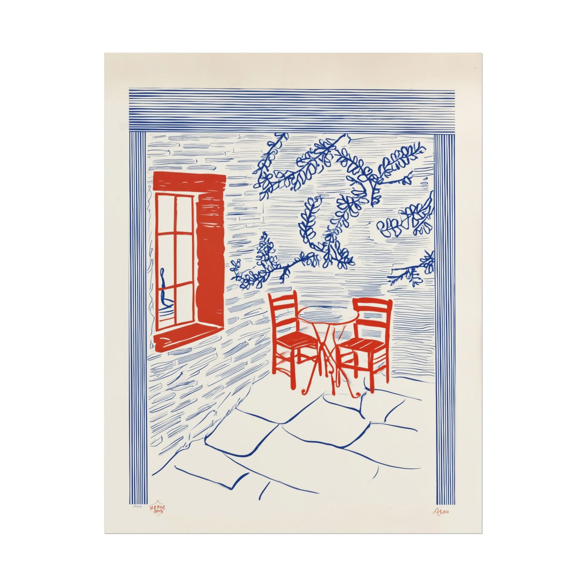 Immerse yourself in the charming simplicity of Cafe Sketch, a piece that echoes the spirit of leisurely afternoons spent in inviting outdoor spaces. The bold use of red and blue against a soft, textured backdrop invites viewers to imagine the warmth and conviviality of a sunlit café. The delicate outlines of chairs and gentle foliage work together to evoke a sense of tranquility, reminiscent of abstract expressionism where color and form speak volumes about mood and atmosphere. This print invites contemplation, transporting you to a peaceful corner where time slows down, making it a delightful addition to any art collection.