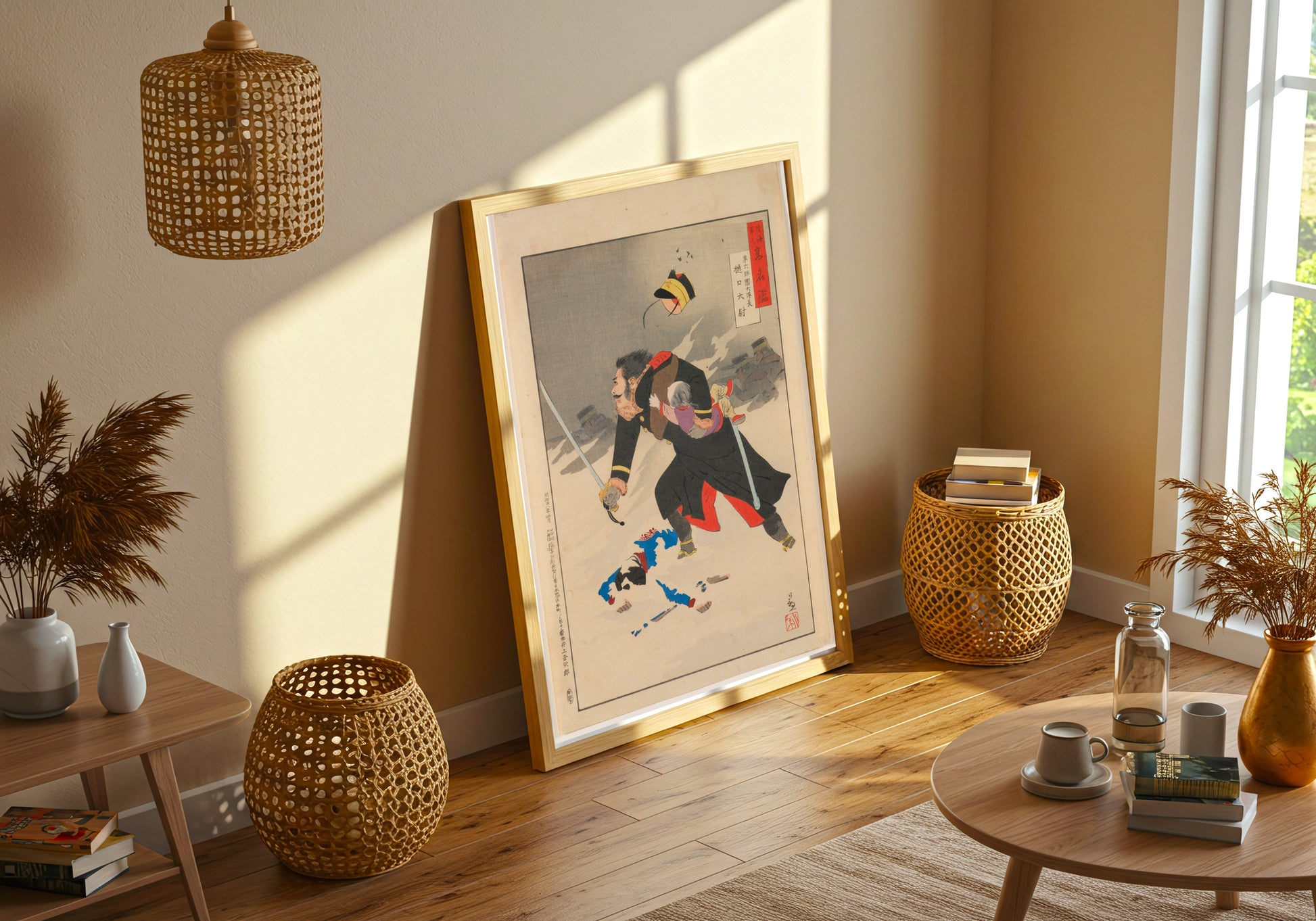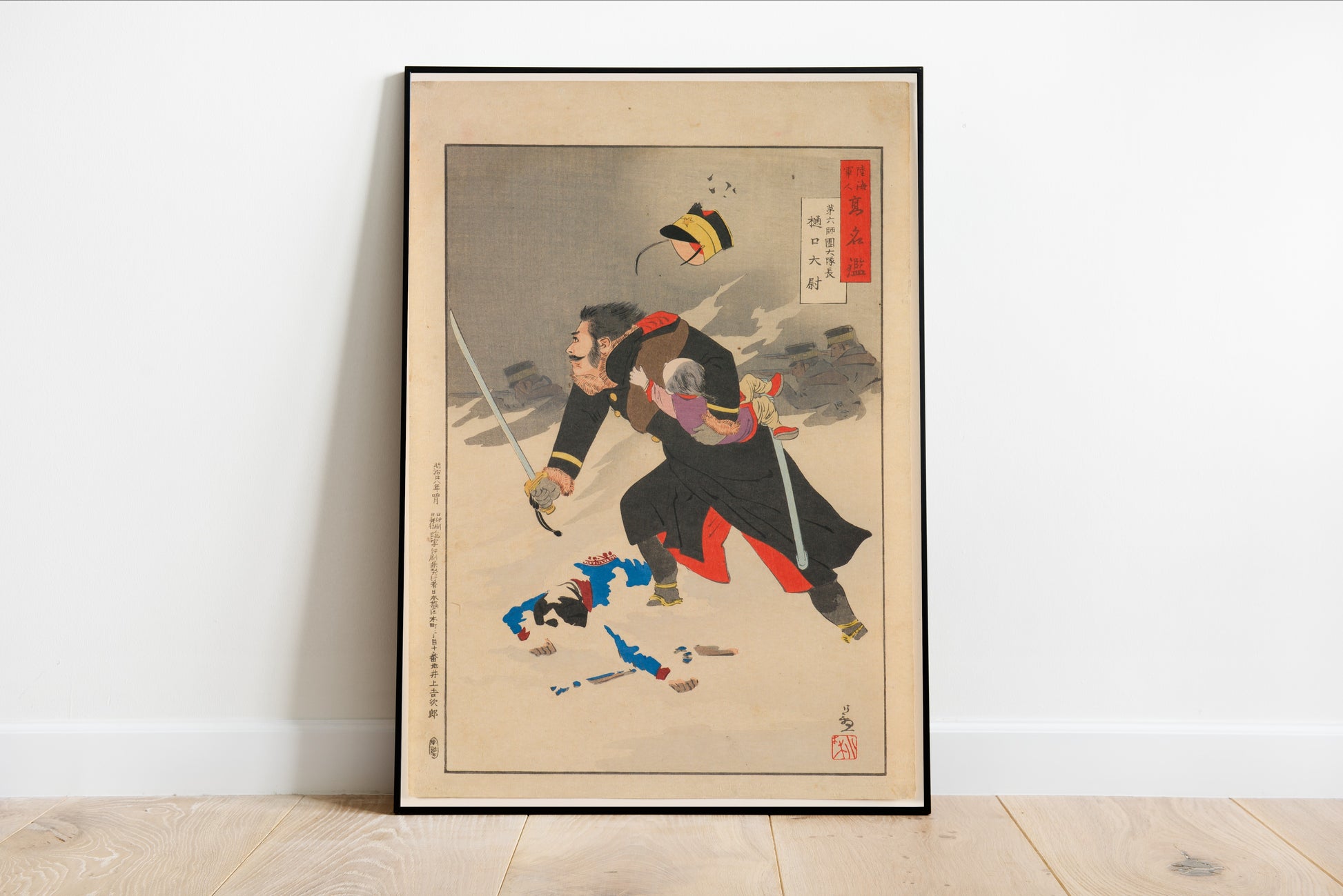Immerse yourself in the compelling narrative of Captain Higuchi by Kobayashi Kiyochika, a striking woodblock print that embodies the tumultuous spirit of Japan during the late 19th century. The commanding figure of Captain Higuchi, sword drawn, captures a moment of intense heroism amidst chaos. The detailed portrayal showcases Kiyochika’s mastery of color and form, blending traditional Ukiyo-e techniques with a profound emotional depth that resonates with viewers. This artwork serves as both a poignant historical vignette and an exploration of the personal conflicts experienced in times of warfare. The atmosphere is charged with tension as Kiyochika’s use of bold colors and sharp contrasts draws the eye to the poignant scene of sacrifice and valor. The juxtaposition of the soldier’s determined expression with the chaos surrounding him speaks to the complexities of honor and duty during a turbulent period in Japanese history. Perfect for those captivated by historical narratives and Japanese art, this print invites reflection on the dualities of bravery and loss, making it a striking addition to any art collection.