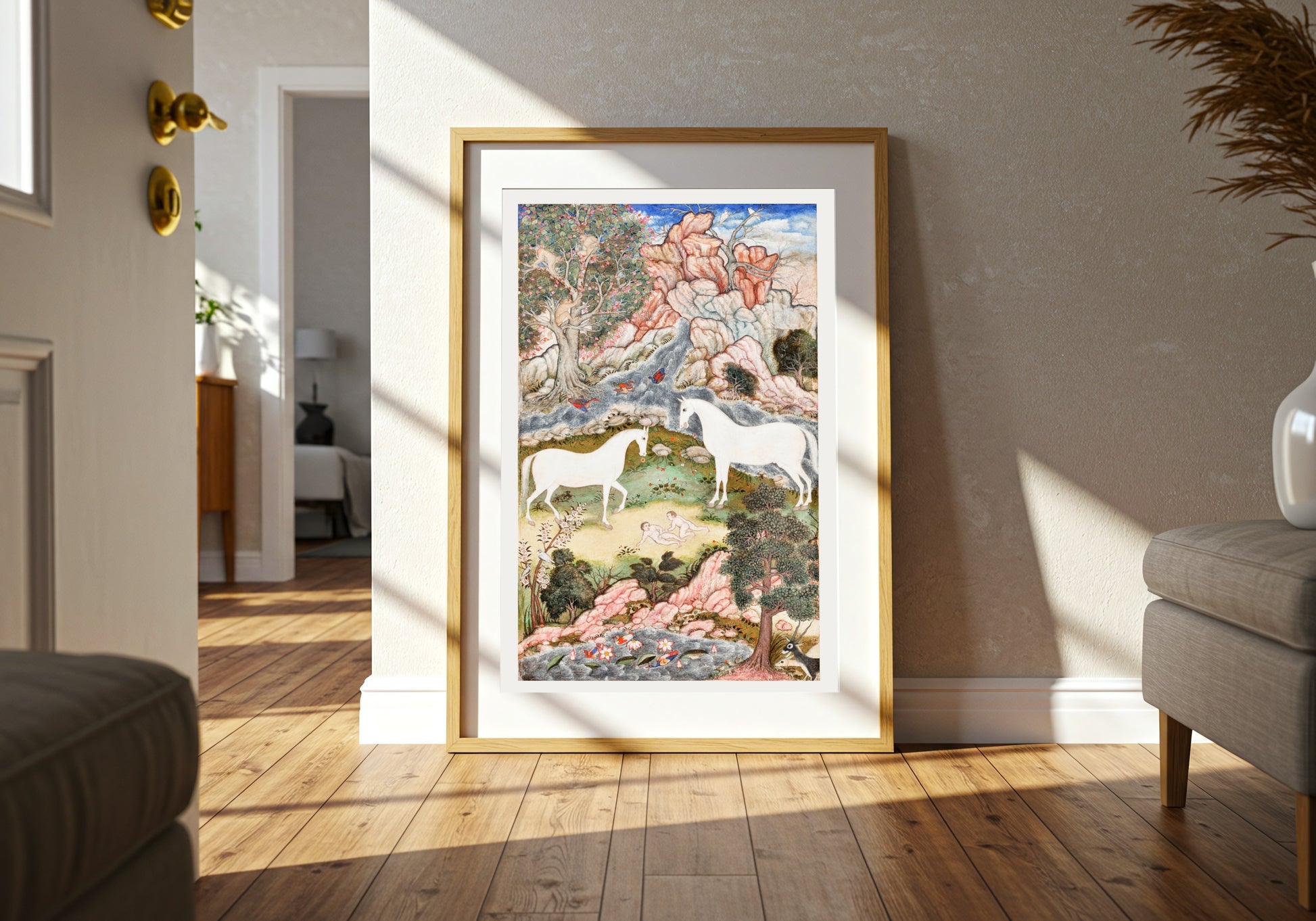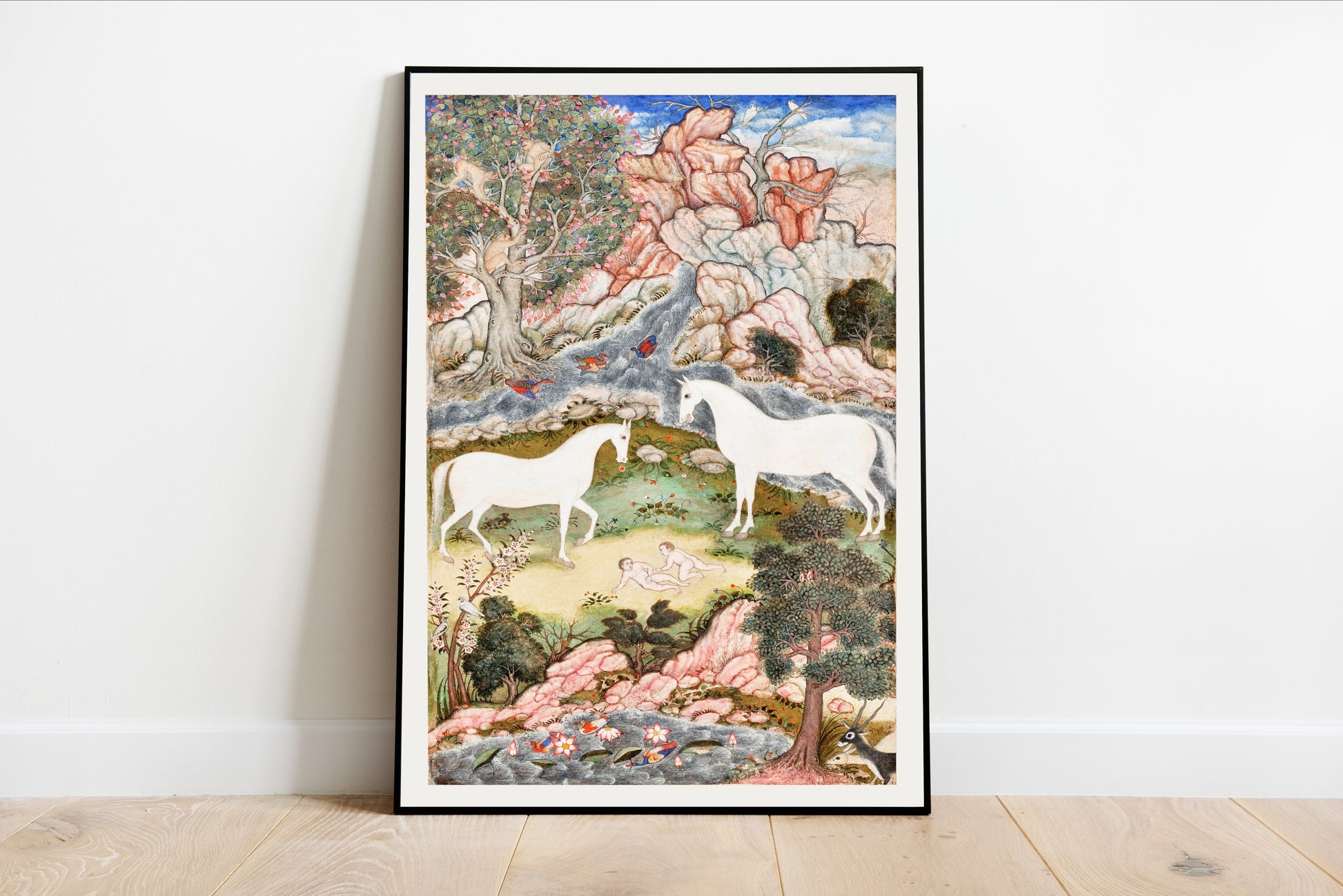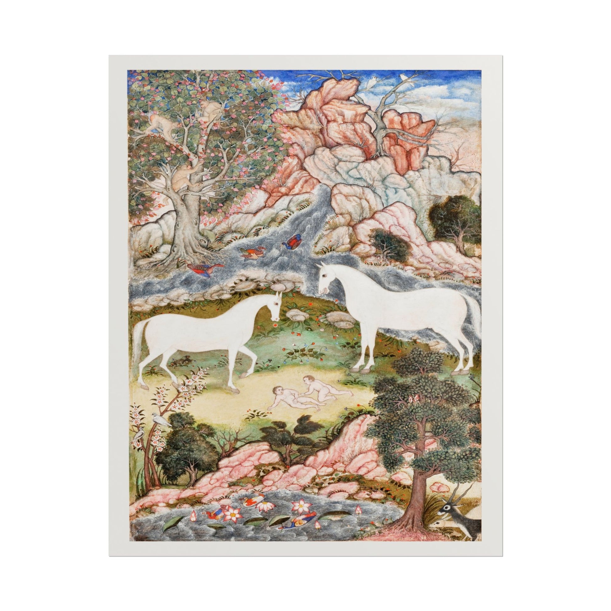 The Celestial Twins Illustration captivates viewers with its enchanting portrayal of serene nature and mythical elegance. Two majestic white unicorns gently graze near a tranquil pond, harmoniously surrounded by vibrant flora and fauna. The rich landscape, dotted with aromatic trees and cascading rocks, draws the eye into a world where fantasy and reality intertwine. Although the artist remains unknown, this piece echoes the delicate intricacies often seen in traditional Persian miniatures, inviting contemplation and a sense of wonder. Ideal for those who appreciate the serene beauty of mythical art, this print brings an ethereal charm to any setting.