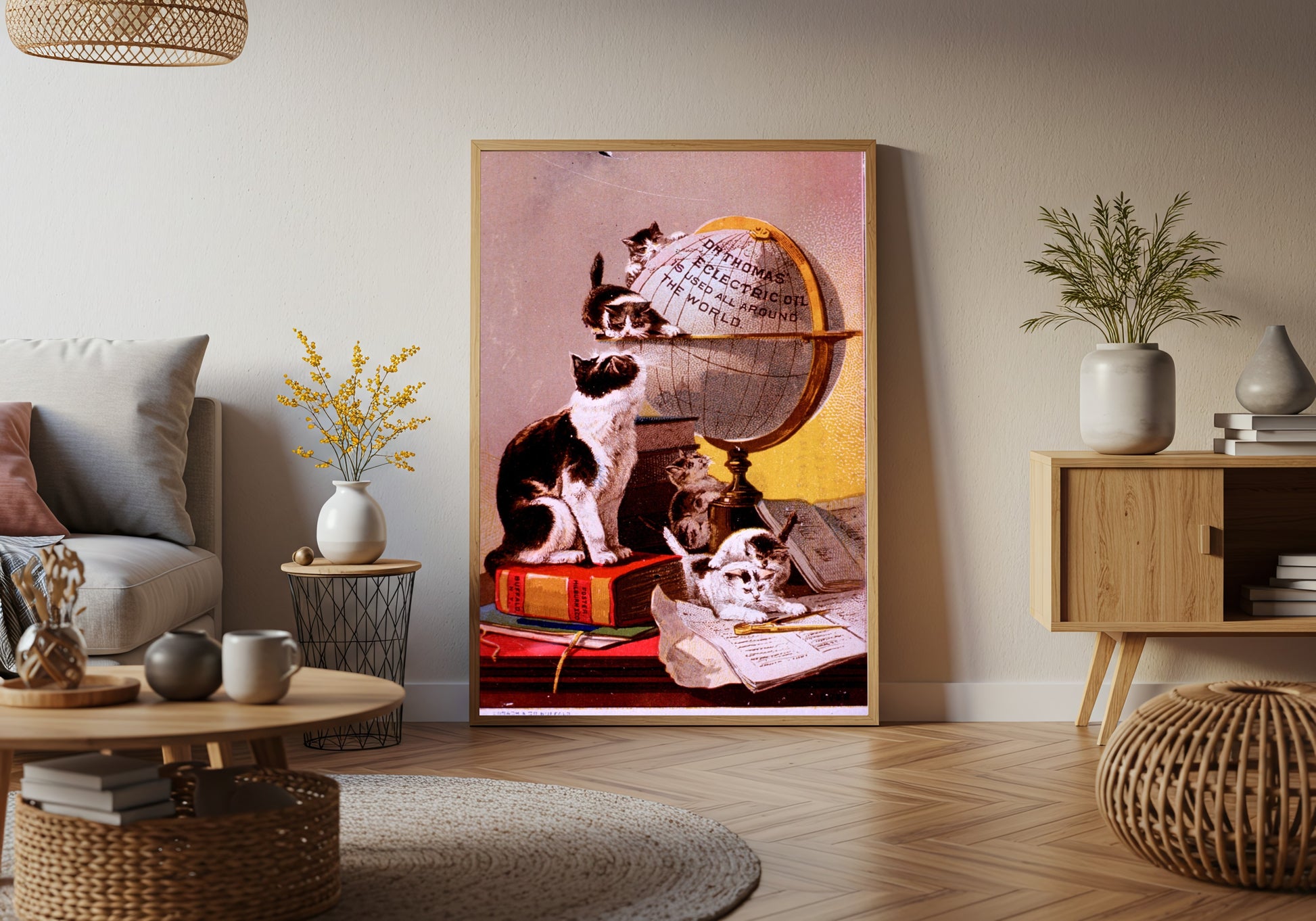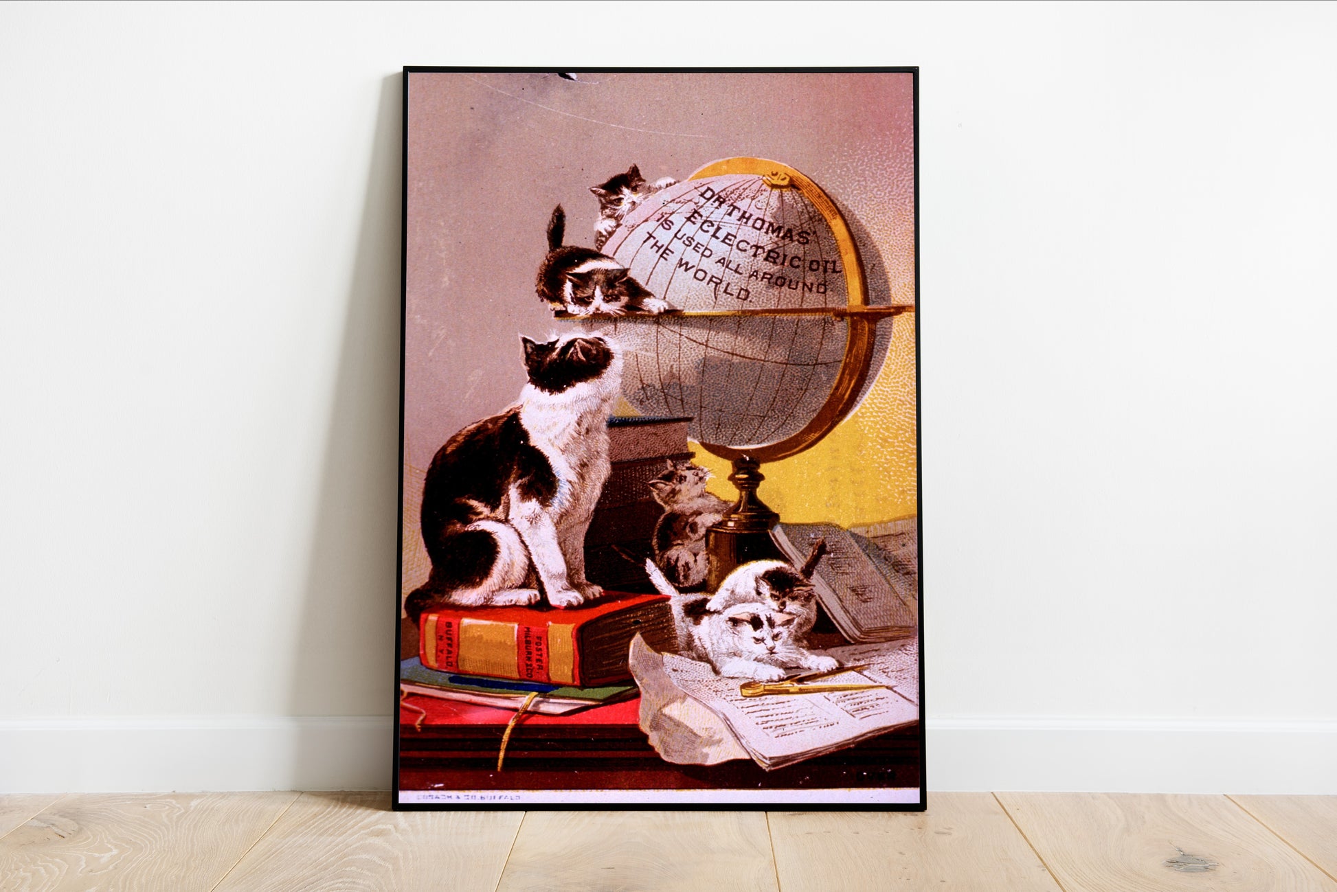 This whimsical advertisement for Dr. Thomas’ Eclectric Oil expertly showcases a delightful scene of charming cats engaging with an antique globe. Vibrant colors and playful compositions create a lively atmosphere, inviting viewers into a world where curiosity and mischief abound. The artist, though unknown, captivates the spirit of late 19th-century advertising art, where intricate illustrations combined humor and whimsy to engage consumers. The playful feline characters symbolize curiosity and exploration, echoing the adventurous spirit of the era. A perfect piece for animal lovers or those with a fondness for vintage advertising, this artwork adds a dash of playful nostalgia to any space.
