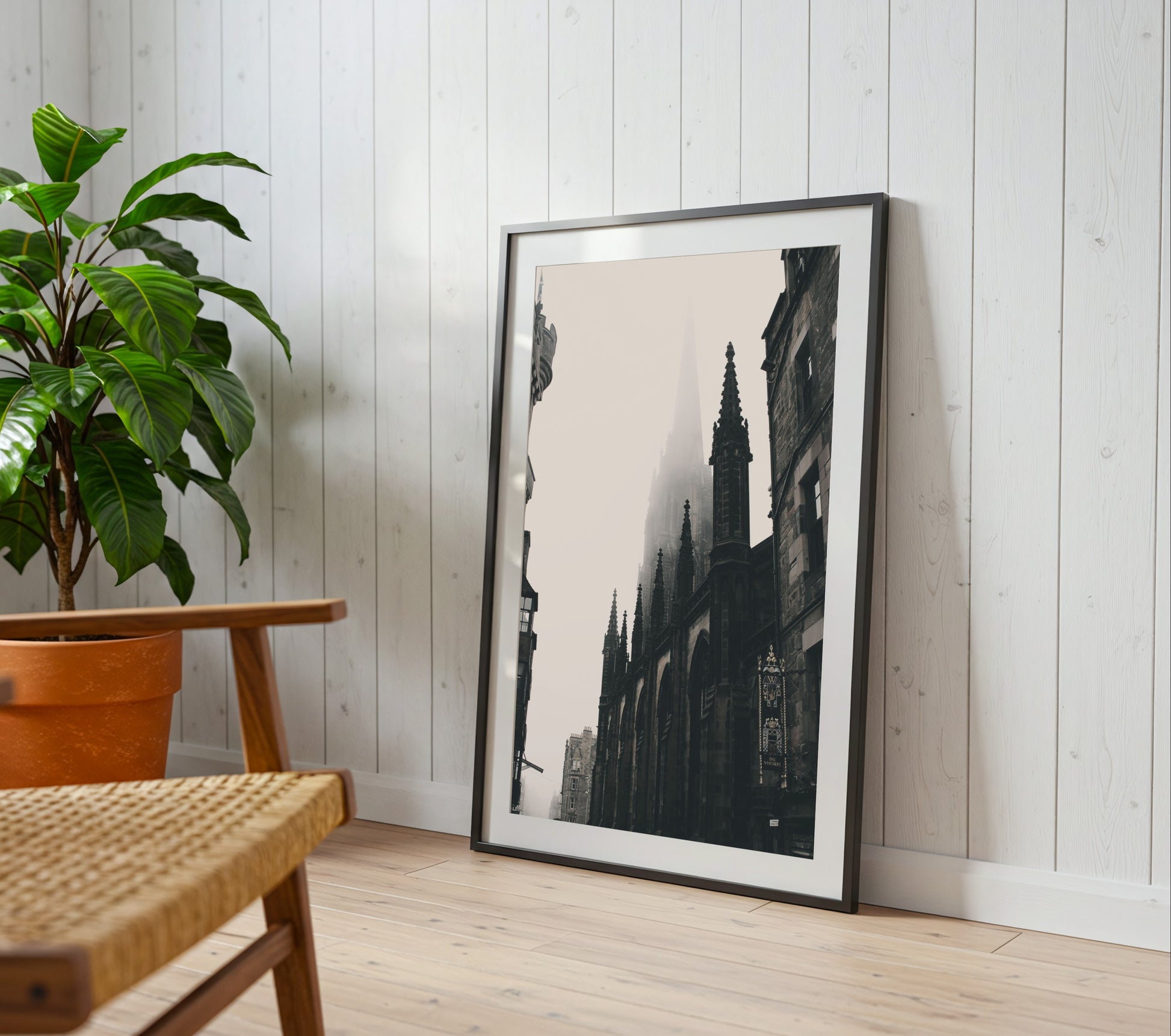 Experience the haunting beauty of the Edinburgh Gothic Cathedral, a mesmerizing fine art print that captures the essence of enduring architecture shrouded in mist. The towering spires and intricate stonework evoke a sense of old-world mystery, creating a striking contrast against the ethereal fog. The play of shadow and light highlights the gothic details, inviting viewers to contemplate the spiritual and historical significance of this iconic structure. This artwork epitomizes the enigmatic allure of Edinburgh, perfect for those drawn to the romanticism of Gothic architecture and its storied past.