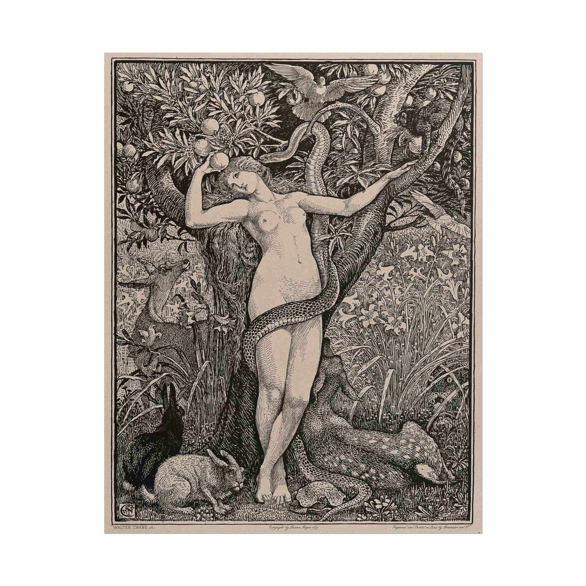 Immerse yourself in the striking visual narrative of Eve and the Serpent, a stunning artwork that captures the tension between innocence and temptation. The languid figure of Eve is entwined with the serpent, her pose conveying both vulnerability and confidence as she interacts with the natural world around her. The intricate details of flora and fauna contrast beautifully with her nude form, encapsulating a moment rich in allegory and symbolism. This piece evokes themes from the biblical story of the Garden of Eden while also resonating with the broader exploration of human nature prevalent in art history. Perfect for those who appreciate intricate designs and thought-provoking imagery, this reproduction invites contemplation and conversation.