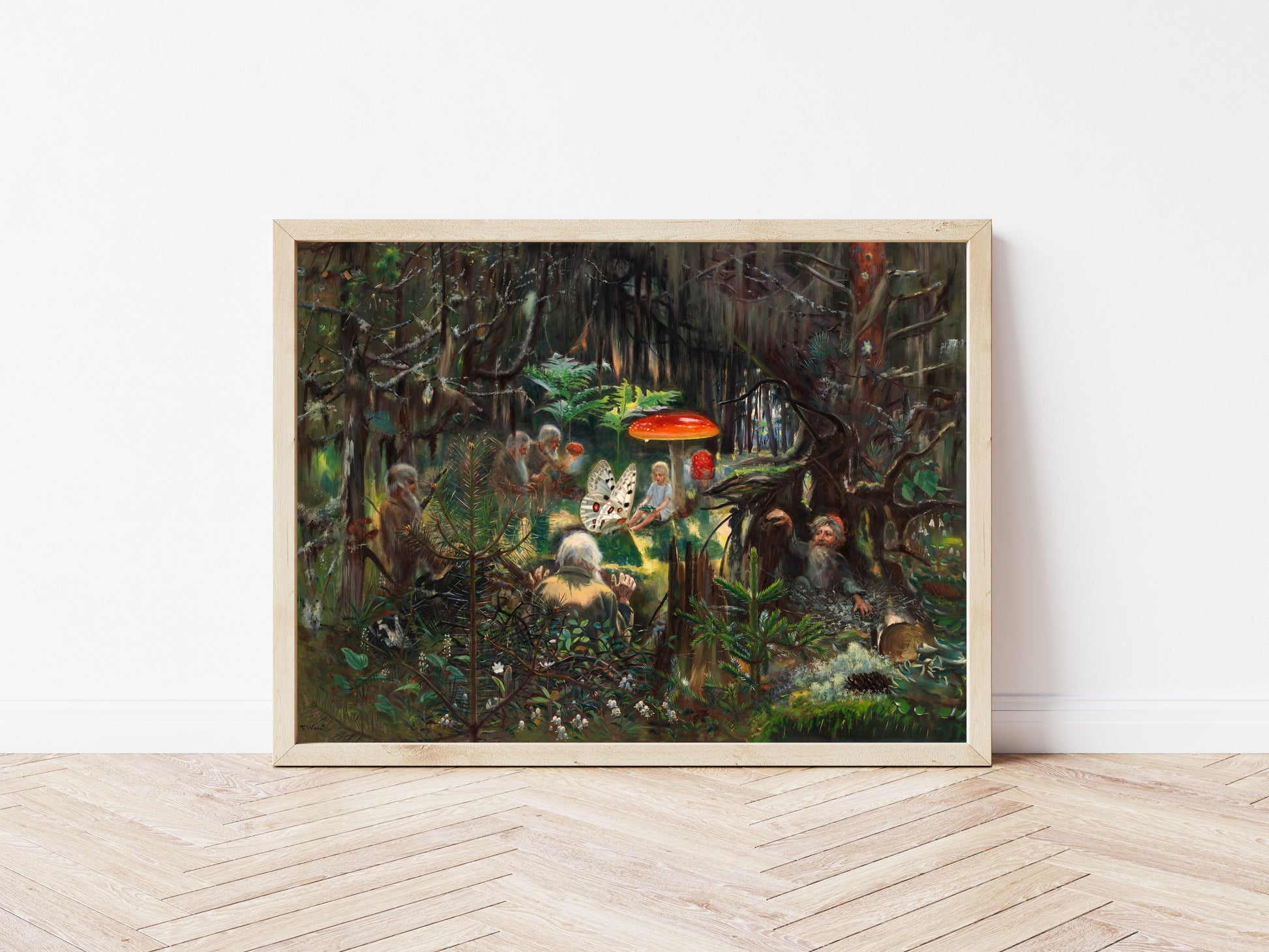 Immerse yourself in the enchanting world of Torsten Wasastjerna’s Fairy Tale Princess, where whimsical imagery intertwines with the wonder of nature. The painting boasts a lush forest scene filled with vibrant greens and soft earth tones, creating a mystical atmosphere that invites viewers to explore the depths of this fairy-tale realm. Delicate figures gather around a bold red mushroom, their expressions reflecting curiosity and enchantment, while a butterfly flutters gently above, symbolizing transformation and fleeting beauty. This evocative piece captures the charm and intrigue of folklore, making it a captivating focal point for those who cherish the magic of storytelling.