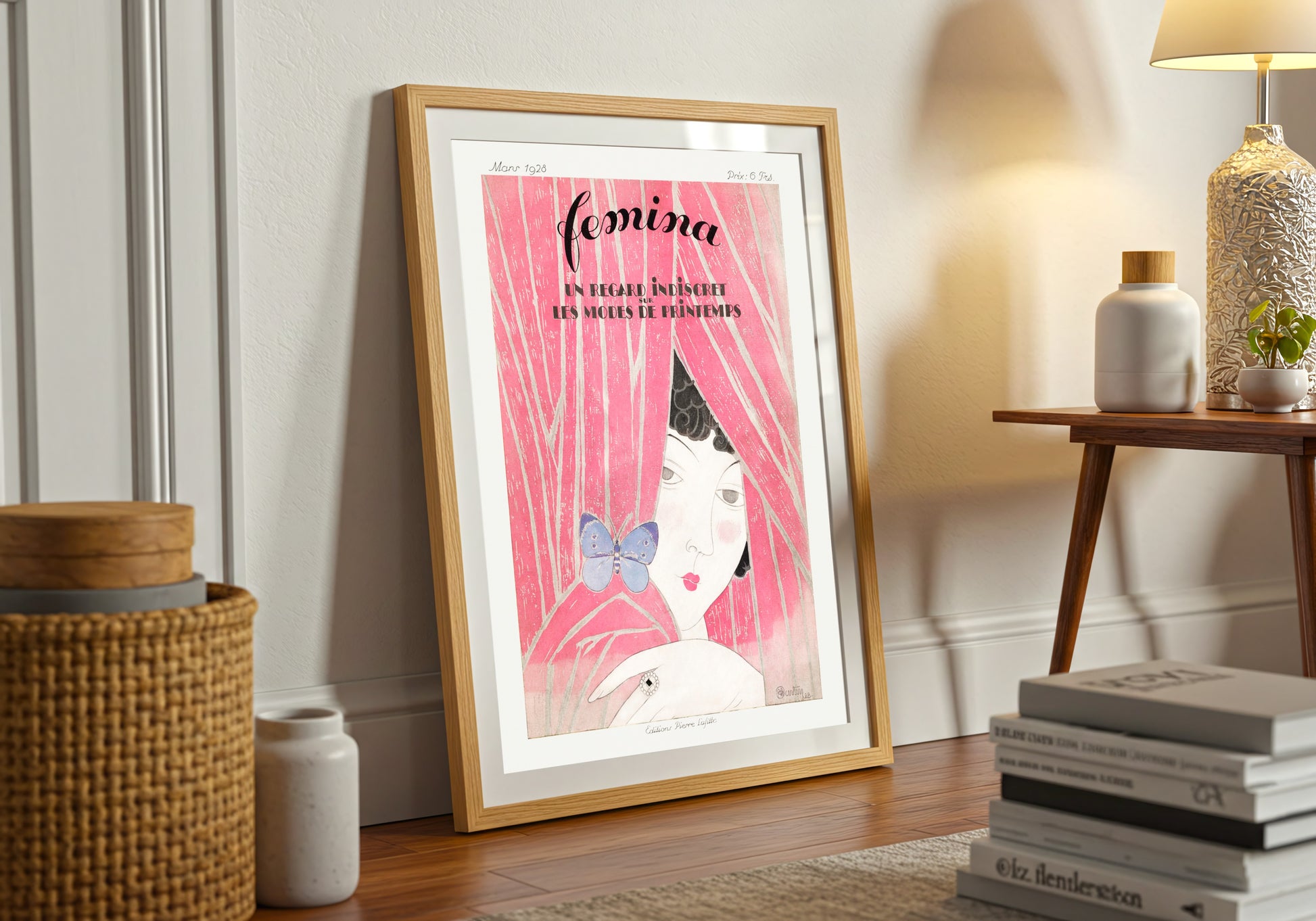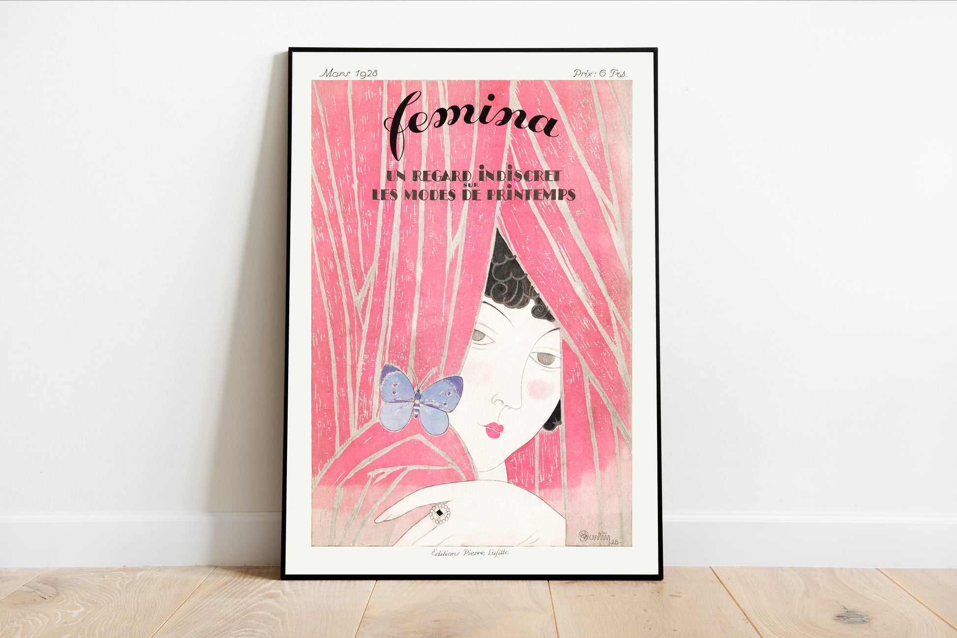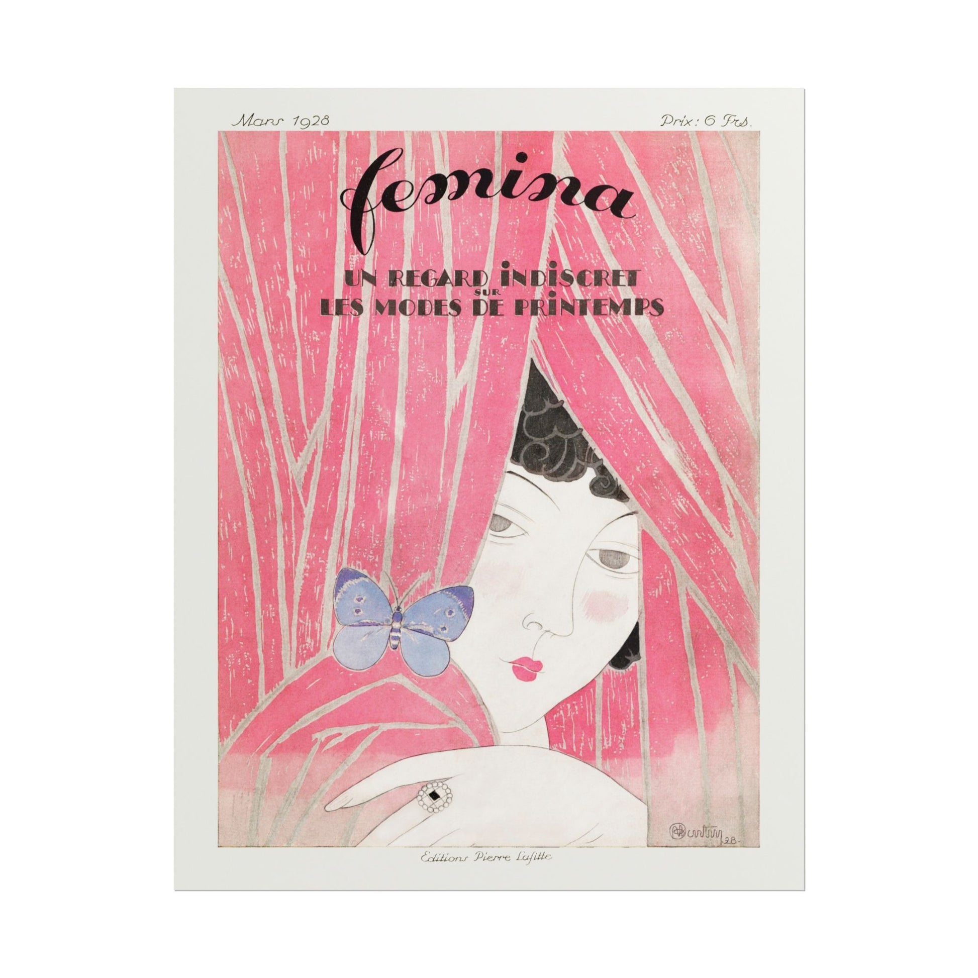 Experience the elegance and intrigue of Femina 1928 Fashion, a captivating print that encapsulates the spirit of the roaring twenties. The artwork features a mysterious woman partially concealed behind luxurious pink drapery, adorned with delicate details, such as a striking butterfly and an exquisite ring. This enigmatic portrayal speaks to the allure of fashion and femininity during a transformative era, where vibrant colors and bold designs reigned supreme. The soft lines and whimsical elements create a dreamlike quality, inviting viewers to explore the interplay between glamor and intimacy inherent in this period.