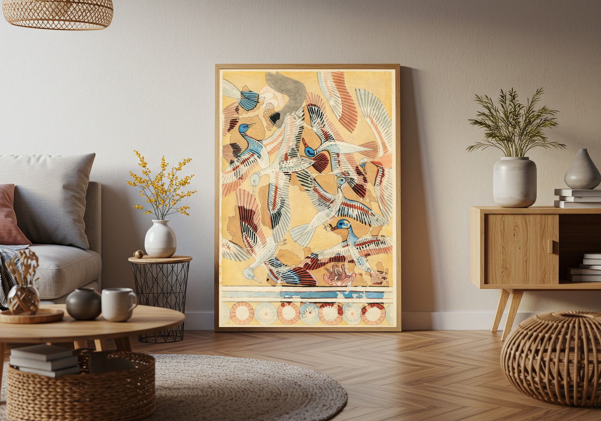 Immerse yourself in the whimsical charm of Flying Ducks by William J. Palmer-Jones, a captivating artwork that elegantly captures the playful movement of birds in flight. The piece is alive with vibrant blues and bold patterns, showcasing a rhythmic dance of ducks that evokes a sense of freedom and spontaneity. Palmer-Jones masterfully employs a decorative style reminiscent of early 20th century designs, blending both fine artistry and intricate detail to create a visually engaging experience. This artwork not only celebrates the beauty of nature through its dynamic composition but also offers a deeper connection to the themes of flight and liberation. The meticulous detailing and the vivid color palette make Flying Ducks a stunning addition to any art collection, inviting viewers to reflect on the joyous essence of avian life. Ideal for those who appreciate both nature-inspired decor and artistry, this print is sure to enliven any space it adorns.