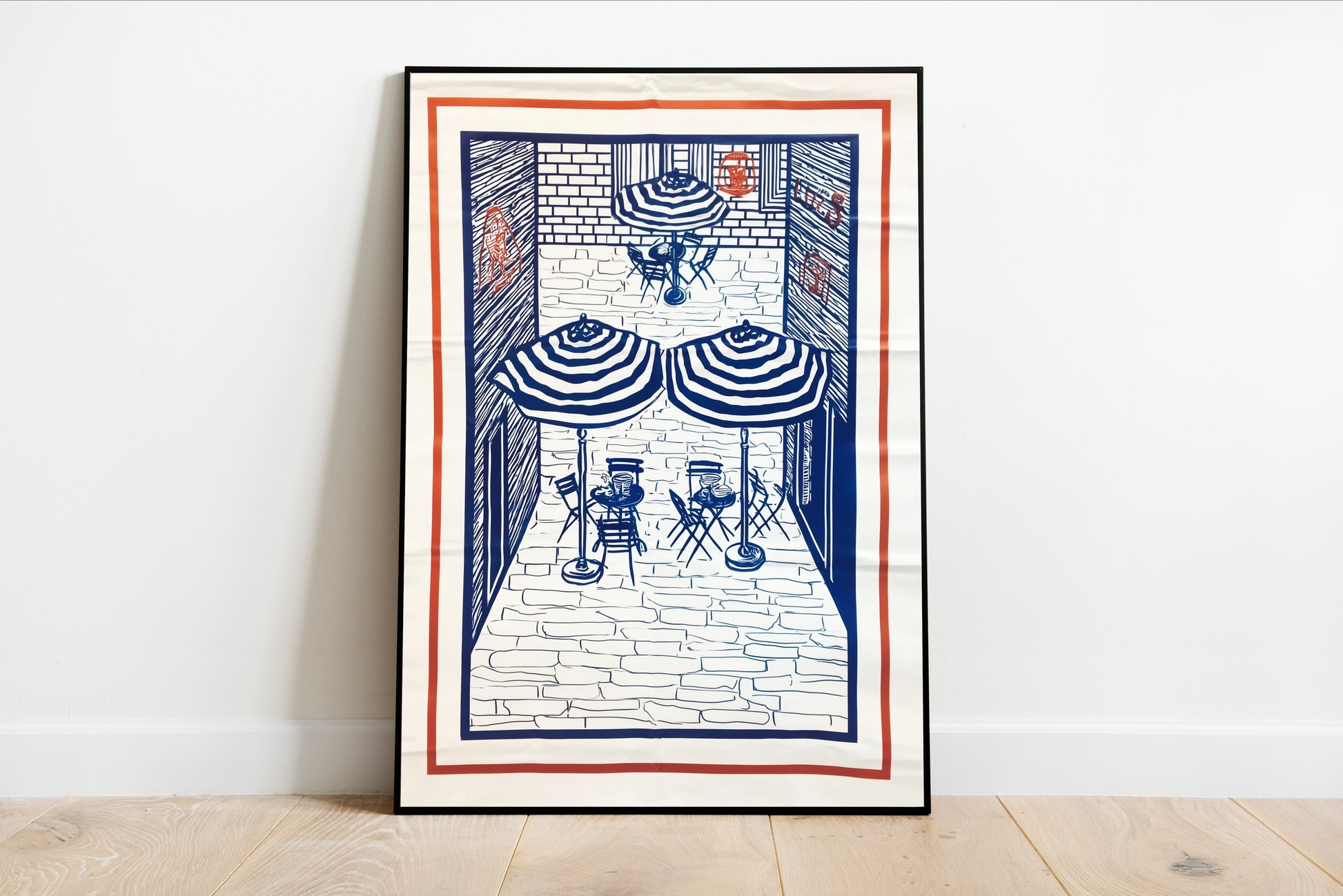 Step into the charming atmosphere of a quaint European street with this captivating print titled French Cafe. Featuring a bold blue and white color palette, the artwork presents a delightful scene of striped umbrellas and inviting seating arrangements, encouraging leisurely afternoons filled with conversation and warmth. The simplicity of the line work evokes a nostalgic elegance, reminiscent of classic French cafés that have inspired countless artists and storytellers throughout history. Ideal for those who appreciate European charm, this piece invites a sense of relaxed leisure and cultural richness into any space.