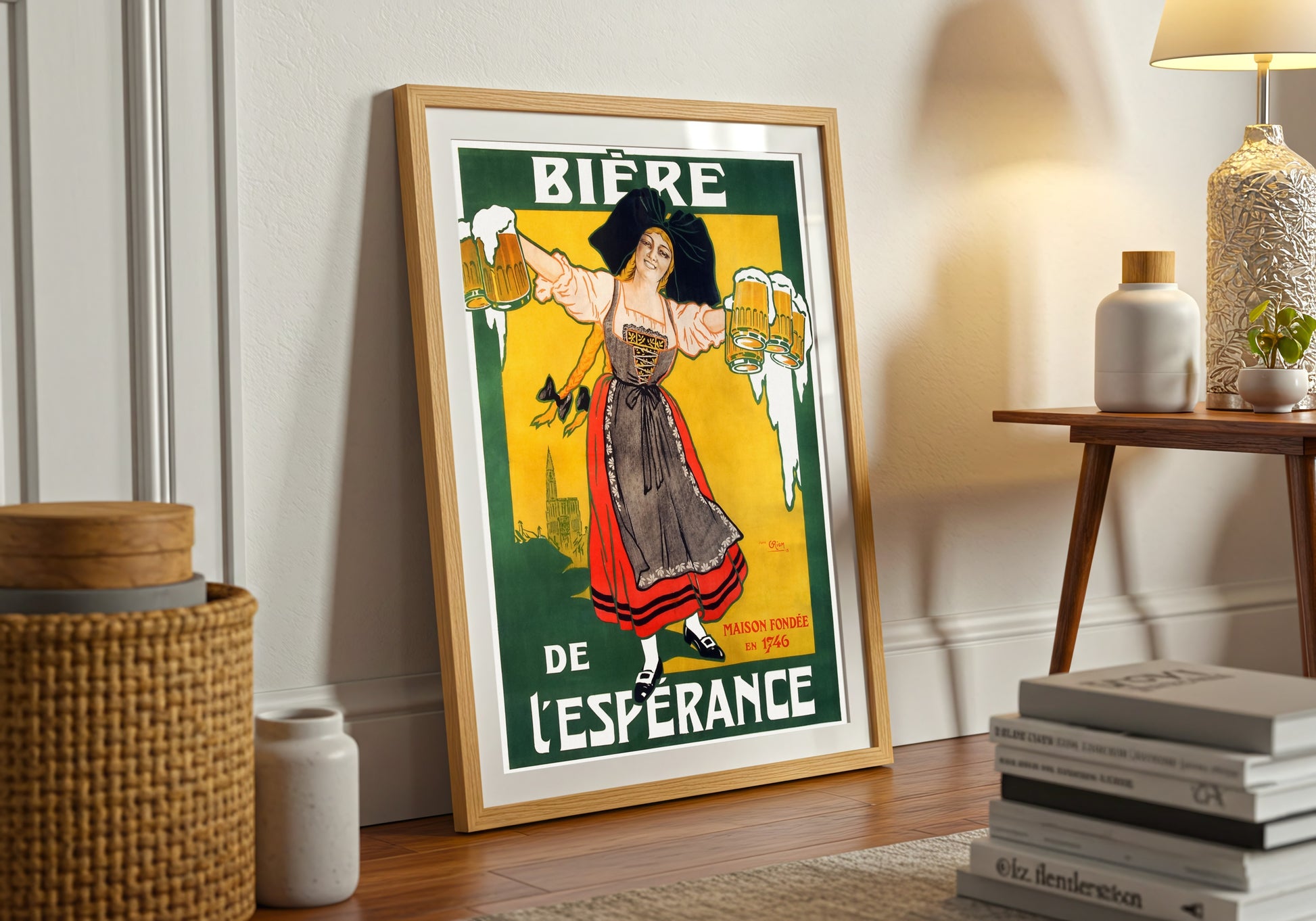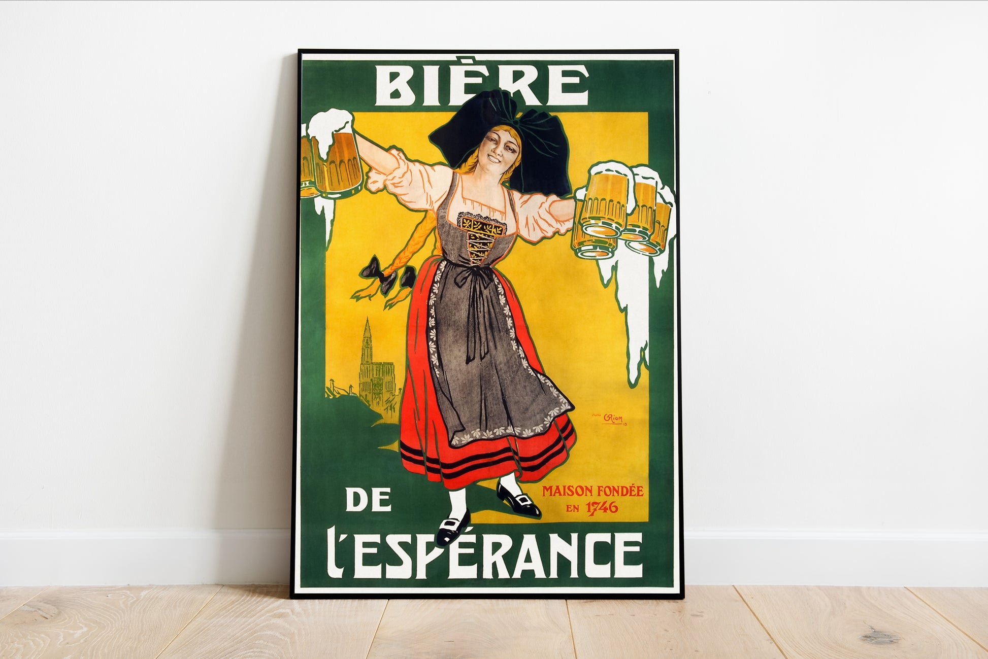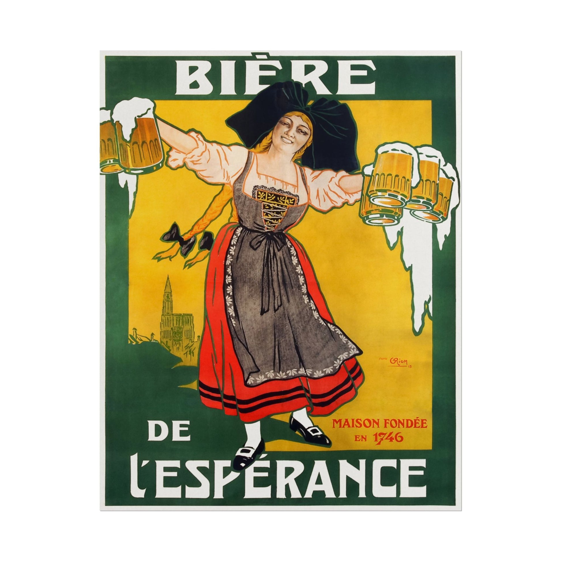 Celebrate the vibrant spirit of German culture with this stunning print, showcasing a lively maiden joyfully holding frothy mugs of beer. The bold colors and energetic composition evoke a sense of festivity and cheer, perfectly capturing the tradition and camaraderie associated with beer culture in Germany. The lively character, adorned in traditional attire, invites viewers into a world of jovial gatherings and celebration. This piece serves as a timeless reminder of the historical significance of brewing and the community it fosters, making it an ideal addition for those who cherish cultural art.
