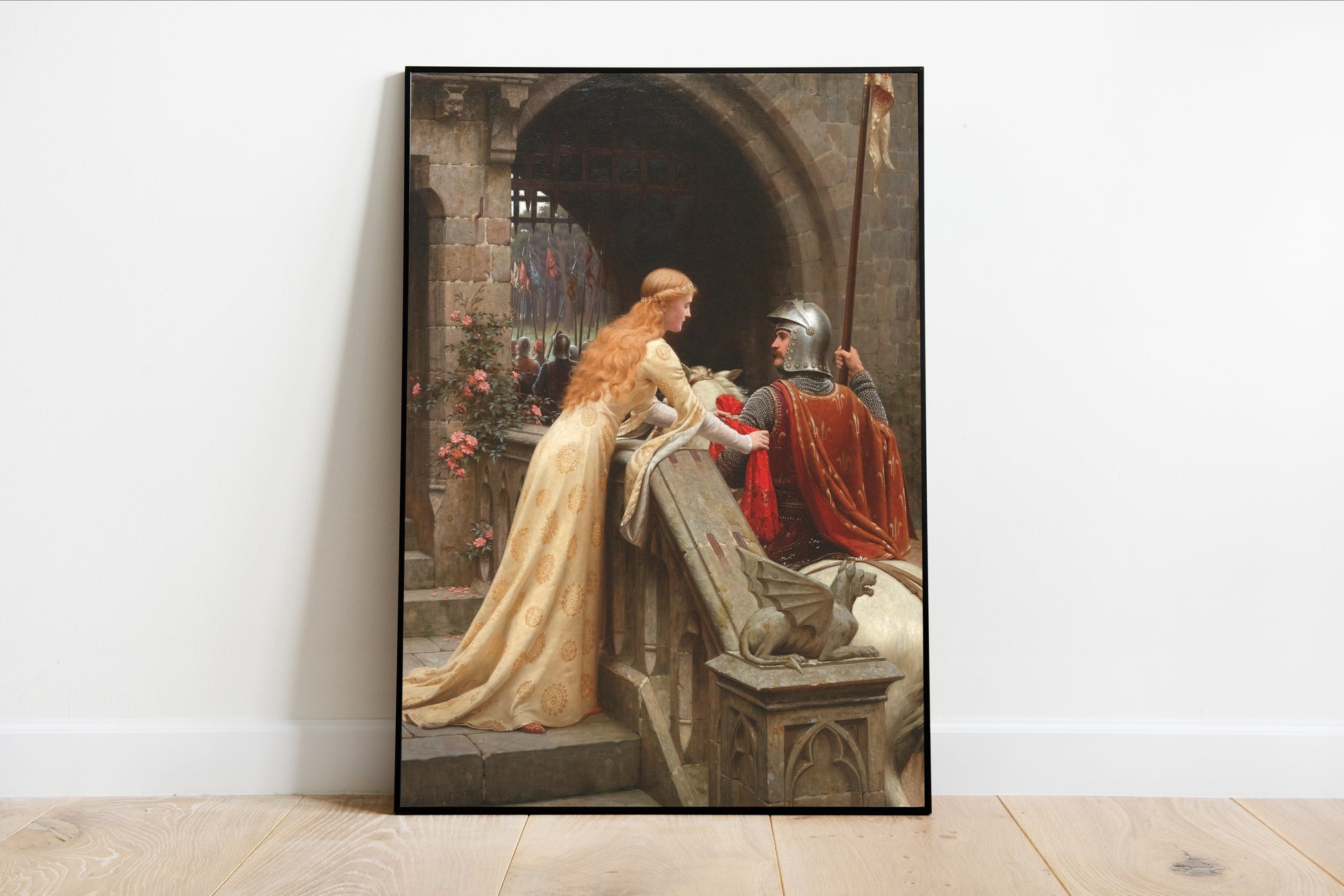 Experience the enchanting world of chivalry and romance with God Speed! by Edmund Leighton. This captivating painting depicts a moment of heartfelt farewell between a noblewoman and her valiant knight, framed by intricate architectural elements that exude medieval charm. The golden tones of the lady's gown and the vibrant reds of the knight's banner create a striking contrast, symbolizing love and valor intertwined. Leighton's meticulous attention to detail and ability to convey emotional depth have made him a celebrated figure of the Pre-Raphaelite movement, where idealized beauty and sentiment reign supreme. This exquisite print adds a touch of historic elegance and dramatic storytelling to any space, inviting admiration and reflection.