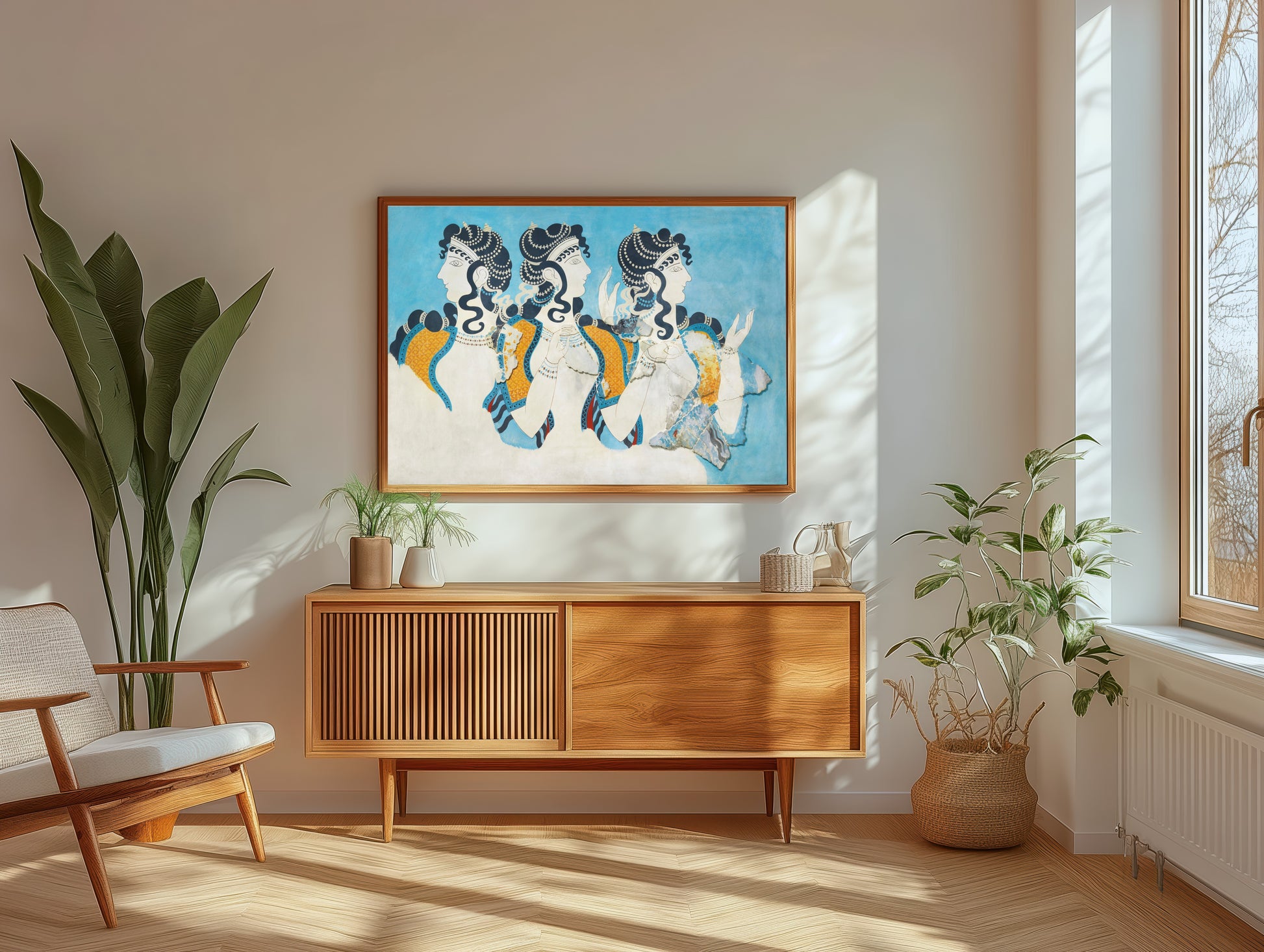 Immerse yourself in the vibrant essence of ancient craftsmanship with Ladies in Blue Fresco. This exquisite artwork, reminiscent of Minoan frescoes, features three elegantly adorned figures in striking blue and gold, embodying a harmonious blend of grace and femininity. The ethereal quality of the figures, set against a serene azure background, invites contemplation and admiration, echoing the richness of Aegean culture. Each character's captivating expression and detailed attire highlight the sophisticated artistry of the time, merging beauty with historical significance. A truly stunning piece, it brings a touch of ancient elegance to any modern setting.