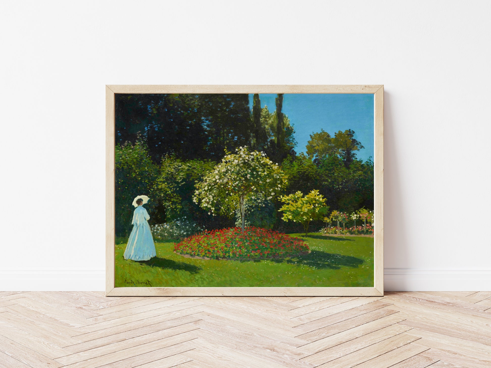 Discover the serene beauty of Lady in the Garden by Claude Monet, a captivating portrayal of nature's splendor that invites the viewer into a lush, tranquil landscape. The painting features a woman in a delicate white dress, elegantly framed against an array of vibrant flowers, embodying the Impressionist mastery of light and color. Monet’s deft brushstrokes create a lively interplay between the blooming garden and the serene figure, evoking feelings of peace and introspection. This artwork captures a fleeting moment in time, celebrating the harmony between humanity and nature—an essence central to the Impressionist movement of the late 19th century.
