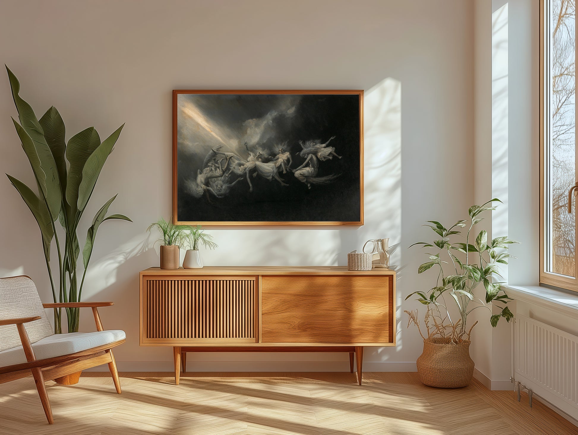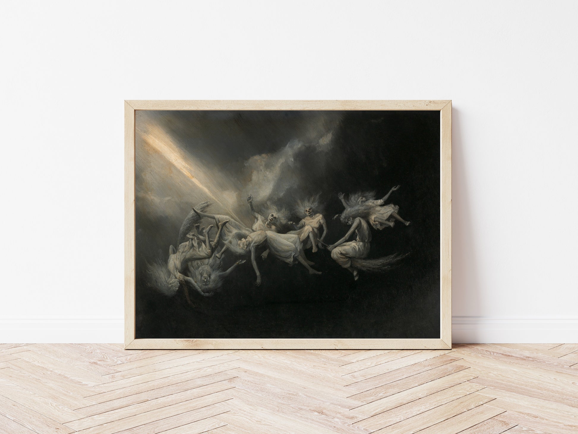 Experience the haunting allure of "Lightning Struck a Flock of Witches" by William Holbrook Beard, a dramatic depiction that captures the ethereal chaos of mythical figures entwined in a stormy embrace. The artwork employs a rich yet muted palette, highlighting the spectral forms of witches spiraling through a tempestuous sky, their flowing garments and wispy hair echoing the power and turbulence of nature itself. This piece reflects Beard’s fascination with the supernatural and his ability to evoke deep emotional resonance through dramatic light and shadow, reminiscent of the Gothic and Romantic movements. As you gaze upon this masterful portrayal of mysticism and transformation, you are drawn into a world where reality blurs with the fantastical.