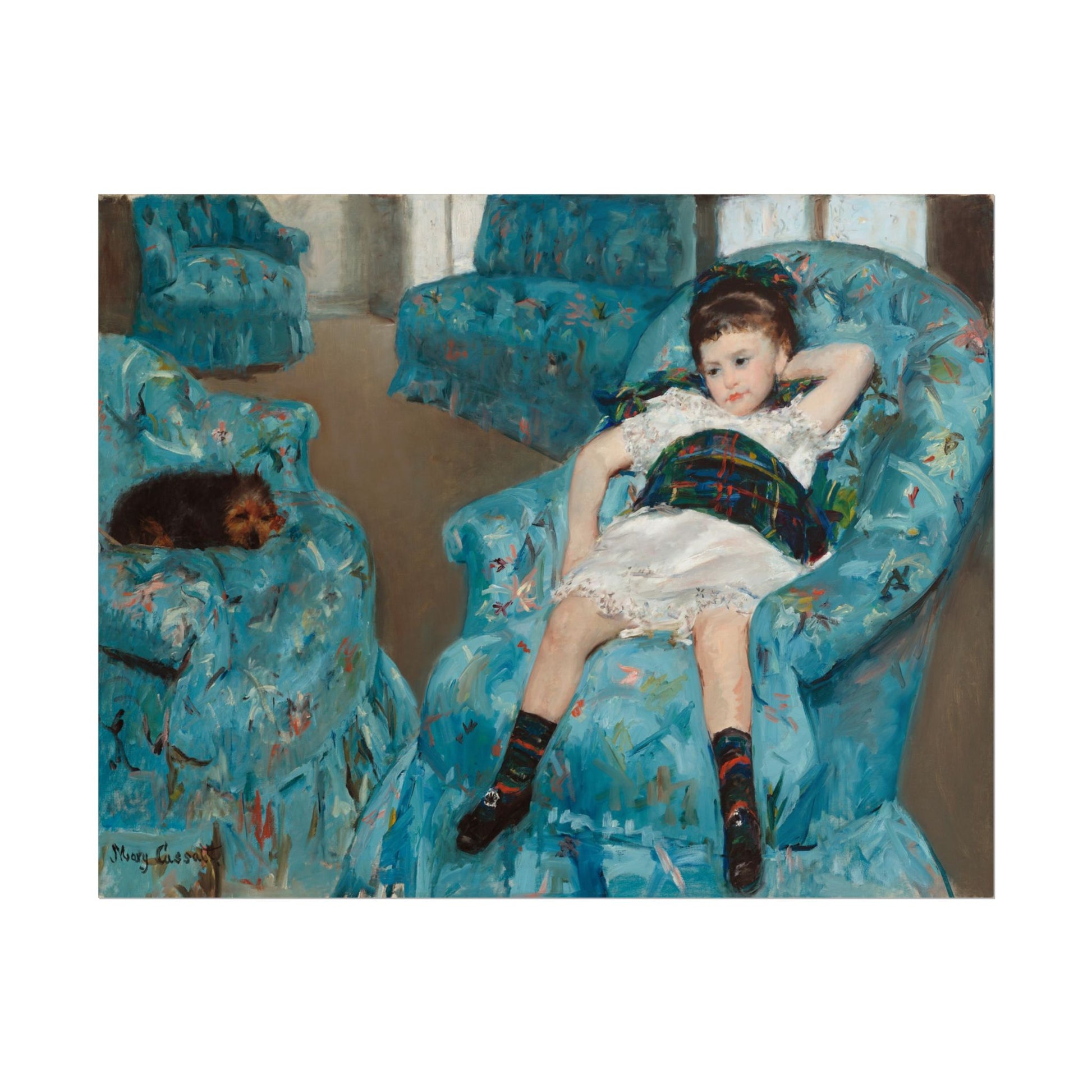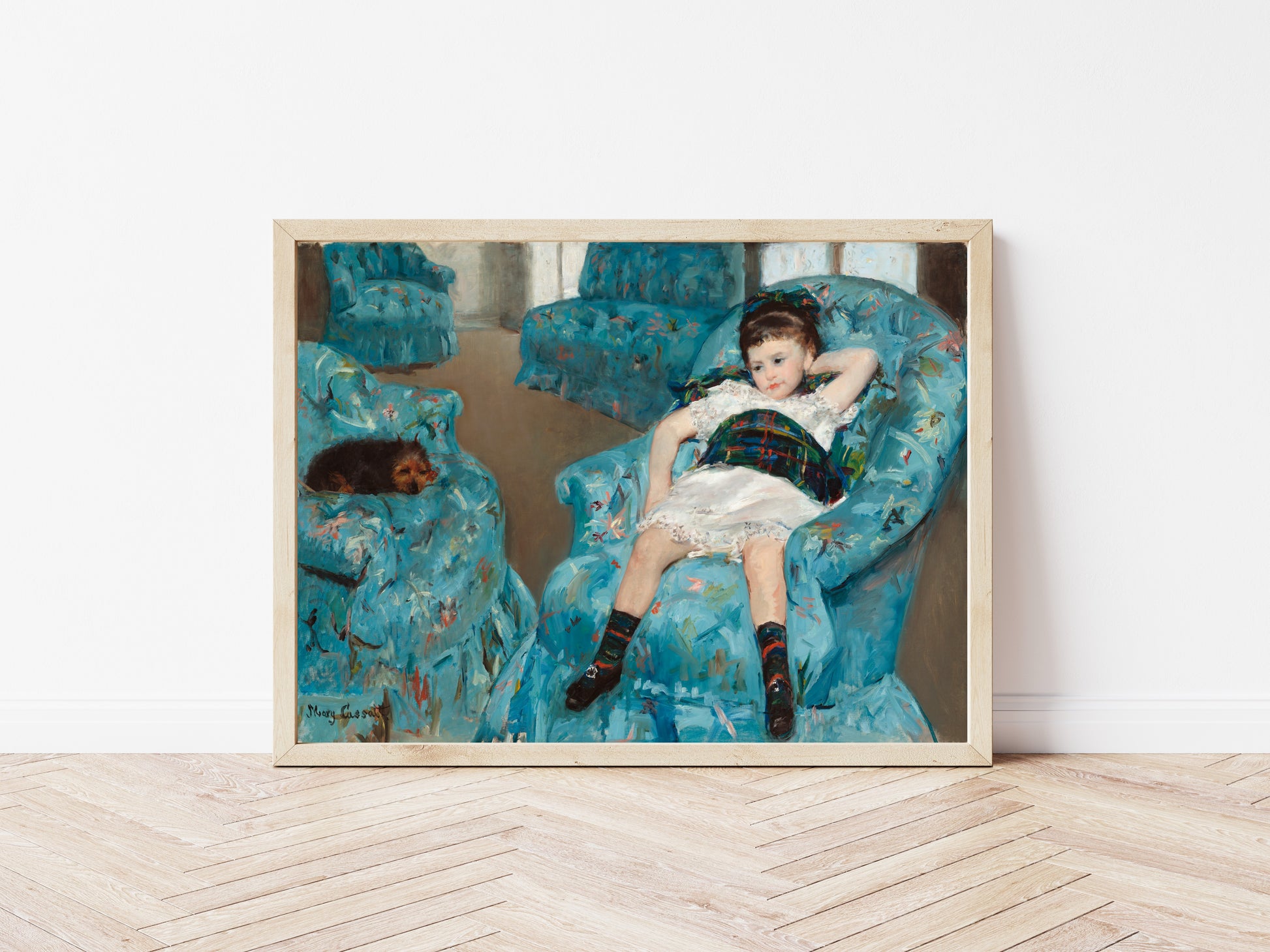 Experience the intimate charm and warmth of Mary Cassatt's Little Girl in a Blue Armchair, a masterful depiction of childhood that conveys both innocence and personality. The vibrant blues of the armchairs envelop the scene, while the young girl, with her thoughtful pose and soft expression, becomes the focal point of this delightful composition. The subtle interplay of light creates a cozy atmosphere, inviting viewers to reflect on the simplicity of childhood moments. Cassatt, a prominent figure in the Impressionist movement, beautifully captures the essence of domestic life, showcasing her adeptness at portraying tender familial bonds and serene interiors.