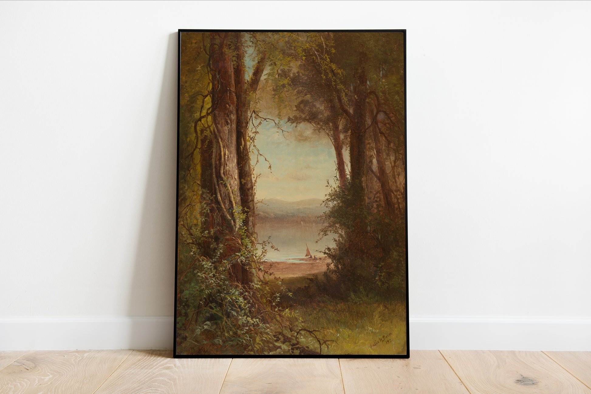 Immerse yourself in the tranquil beauty of "Looking upon the River" by Julie Hart Beers, a stunning depiction that invites reflection and serenity. Richly detailed, this artwork captures a peaceful riverside scene framed by towering trees, their verdant foliage creating a natural gateway to the distant waters. The gentle sailboat gliding along the smooth surface evokes a sense of harmony and leisure, inviting viewers to lose themselves in nature's embrace. This piece exemplifies the American landscape tradition, showcasing Beers' ability to blend realism with a poetic touch, making it a perfect addition for lovers of serene natural landscapes.