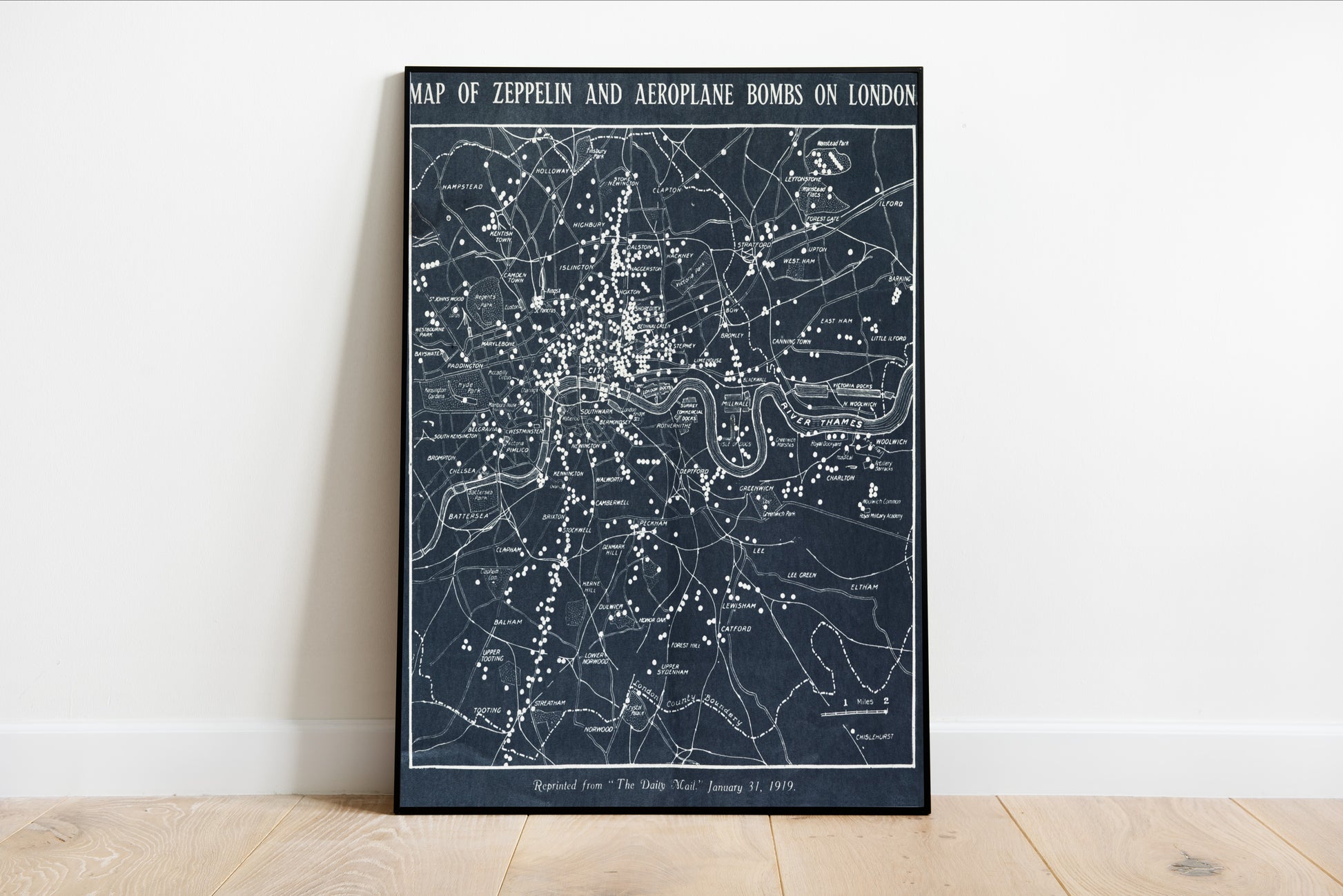 Discover a profound piece of historical cartography with the *Map of Zeppelin*, an evocative representation of London during World War I. This striking map, saturated in rich, dark tones, features precise points marking the locations of Zeppelin and aeroplane bombings, creating a somber reminder of the city's wartime trials. The meticulous placement of the white dots against the navy backdrop draws the eye, capturing the stark reality of urban life under threat and inviting reflection on resilience and vulnerability. This artwork serves as both a significant historical document and a commentary on the impact of warfare on civilian spaces.