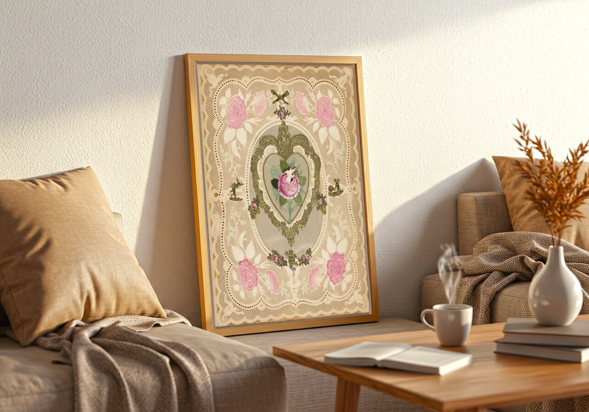 The charming print, Pink Flowers Putti, envelops viewers in a whimsical embrace of pastel hues and intricate detailing. This enchanting piece features soft pink roses, decorated with delicate lace accents that evoke a sense of romance and nostalgia, reminiscent of late 19th-century floral art. Its heart-shaped central motif cradles a delightful putti, symbolizing innocence and playfulness, adding an element of timeless charm. Ideal for lovers of vintage aesthetics, this artwork serves as a perfect tribute to the delicate craftsmanship typical of its era. The unknown artist expertly weaves together intricate textures and colors, creating a harmonious composition that invites admiration. With its lush floral symbolism and ethereal quality, Pink Flowers Putti will infuse any space with a touch of elegance and grace, making it a delightful choice for eclectic decor enthusiasts.