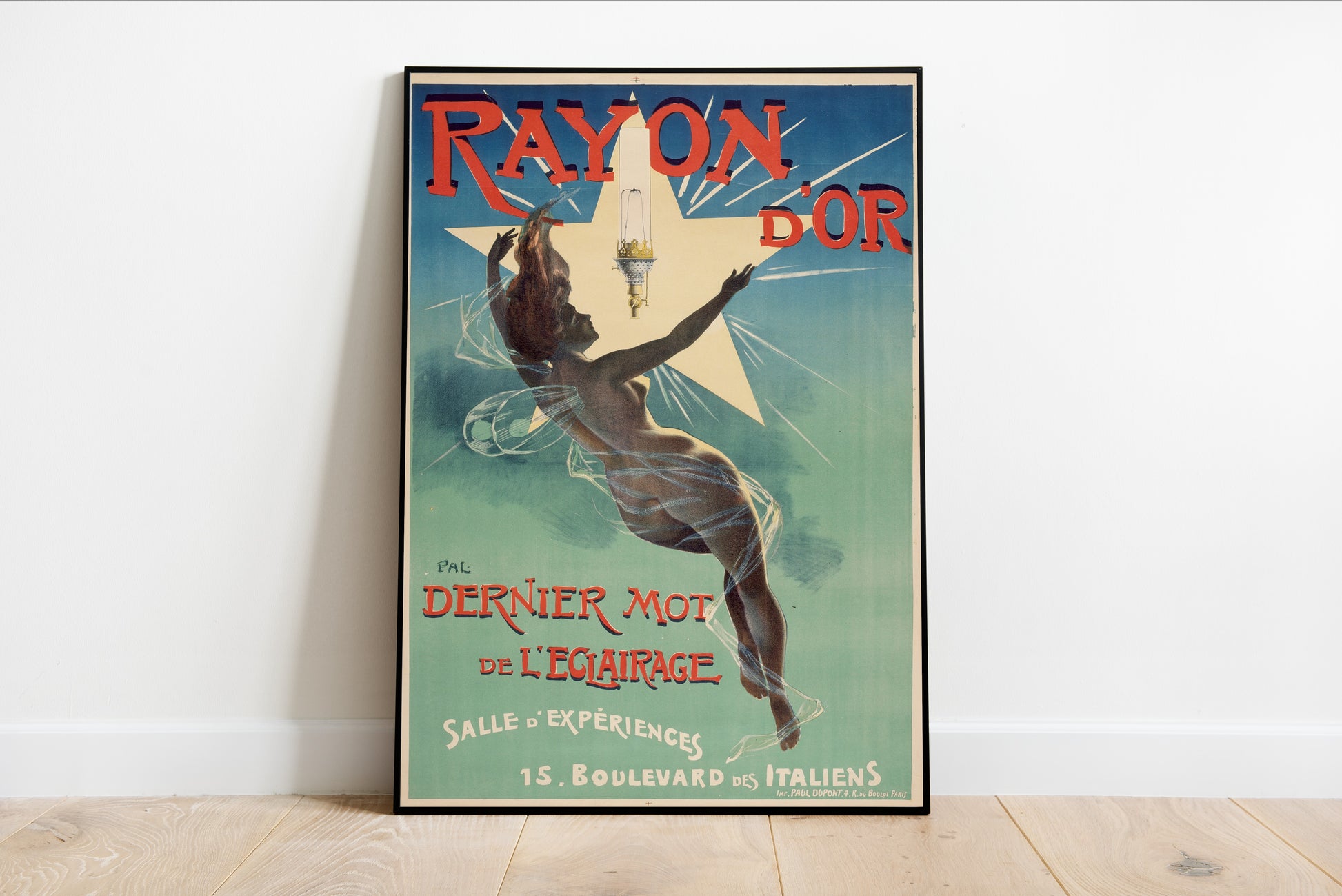 Immerse yourself in the enchanting world of Rayon d’Or by Jean de Paleologu, a captivating art print that combines fluid movement with a sense of ethereal beauty. The central figure, draped in soft, wispy forms, radiates with the vibrant call of the lightbulb above, symbolizing innovation and modernity in the early 20th century. The striking color palette of deep blues and radiant reds enhances the dreamlike quality, making this piece a stunning representation of the Belle Époque era. With its dynamic composition and elegant lines, Paleologu's work invites viewers to explore the interplay of light and beauty, making it a remarkable addition to any fine art collection.