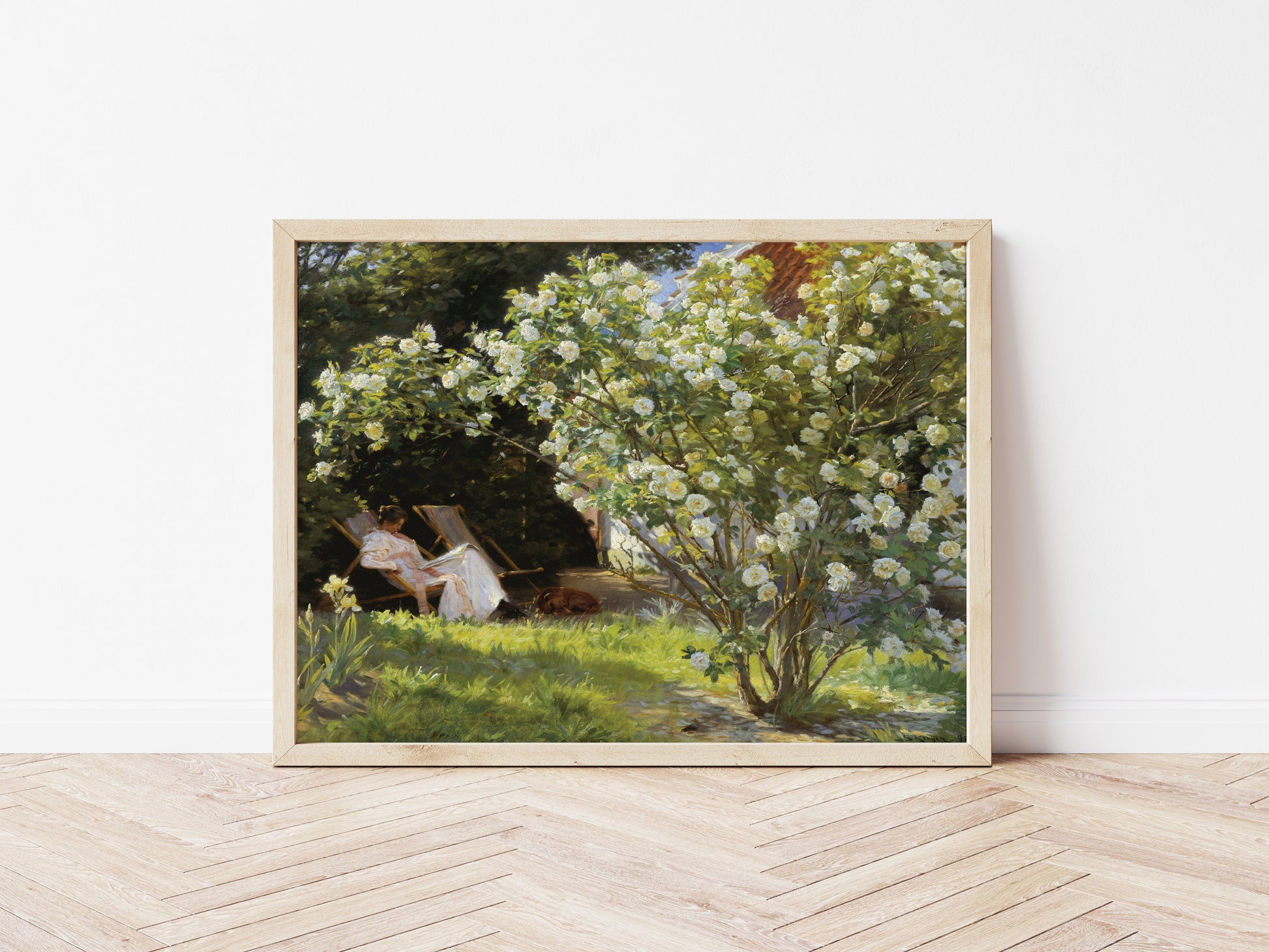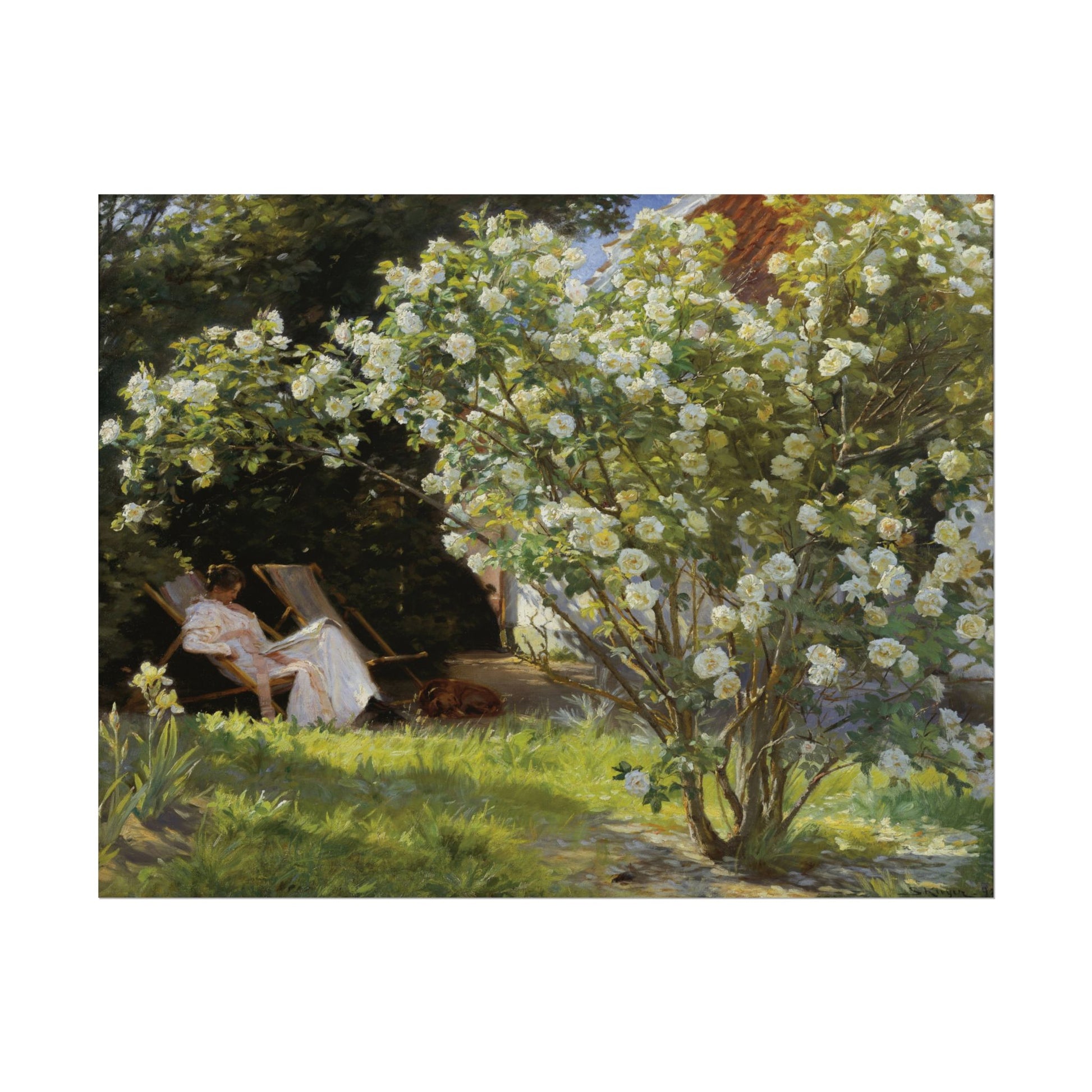 Immerse yourself in the serene beauty of Roses by P.S. Kroyer, a stunning representation of nature’s gentleness and tranquility. This exquisite artwork captures a moment in time, where a woman in a flowing white dress is enveloped by a fragrant sea of blooming white roses, her quiet contemplation in harmony with the lush greenery around her. The delicate brushwork and soft light reflect the peaceful ambiance of a garden alive with the promise of warmth and renewal, reminiscent of the Impressionist movement that celebrated nature and everyday life. Kroyer’s mastery lies not only in his depiction of flora but also in the emotional resonance that such serene moments evoke, making this piece a perfect homage to life's simple pleasures.