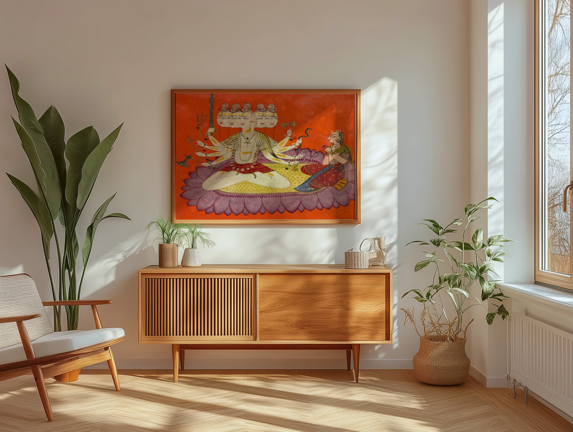 Immerse yourself in the spiritual depth of Sadashiva Worshipped by Parvati, a stunning illustration that resonates with tranquility and divine energy. The artwork presents a serene figure of Sadashiva, adorned with ornate jewelry and vibrant colors, seated gracefully on a lotus that symbolizes purity and enlightenment. Eight arms extending outward each hold potent symbols of power and knowledge, while the striking orange background creates an atmosphere of warmth and reverence. Parvati’s vivid palette and intricate detailing reflect the beauty synonymous with traditional Indian art, capturing the essence of devotion and spiritual connection. This piece is perfect for those who appreciate the rich tapestry of Hindu mythology and the artistry of historical narratives.