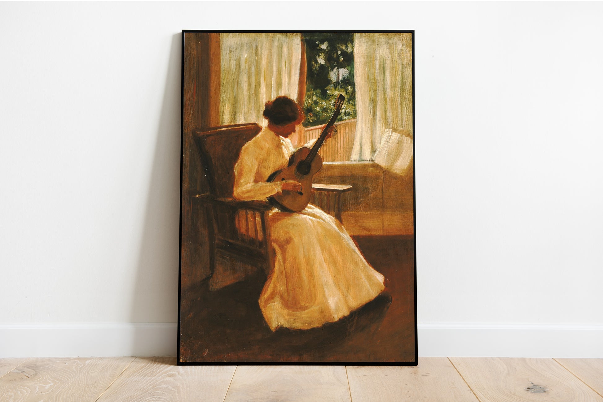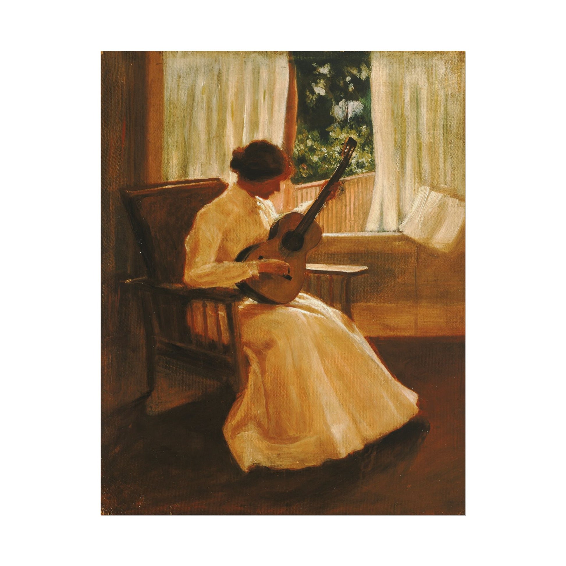 Experience a serene moment captured in "Summer" by Kate Clifton Osgood Holmes, where a young woman is immersed in the intimate act of playing the guitar. Warm, golden tones envelop the scene, creating a cozy atmosphere that invites the viewer into her peaceful world. The soft, diffused light pouring through the window highlights her flowing gown and enhances the tranquil mood, evoking a sense of nostalgia and calm. This artwork beautifully embodies the quiet joys of summer afternoons, reflecting the artist's masterful handling of light and shadow, reminiscent of late 19th-century impressionism.