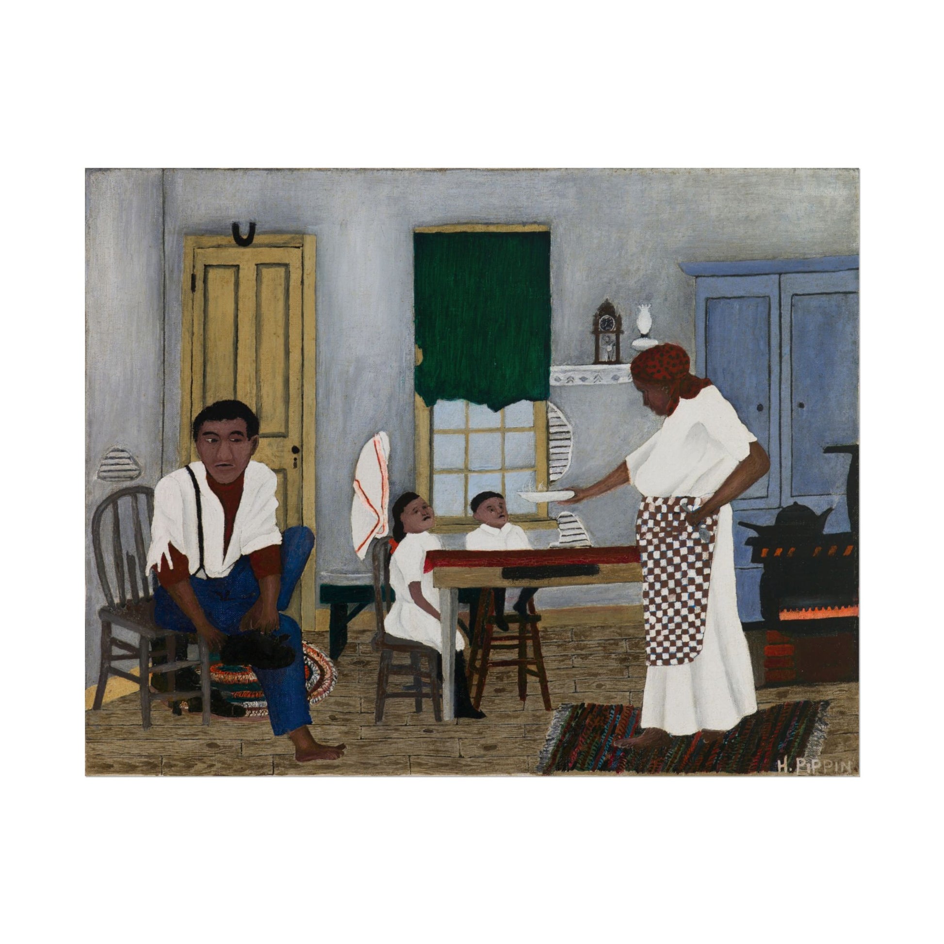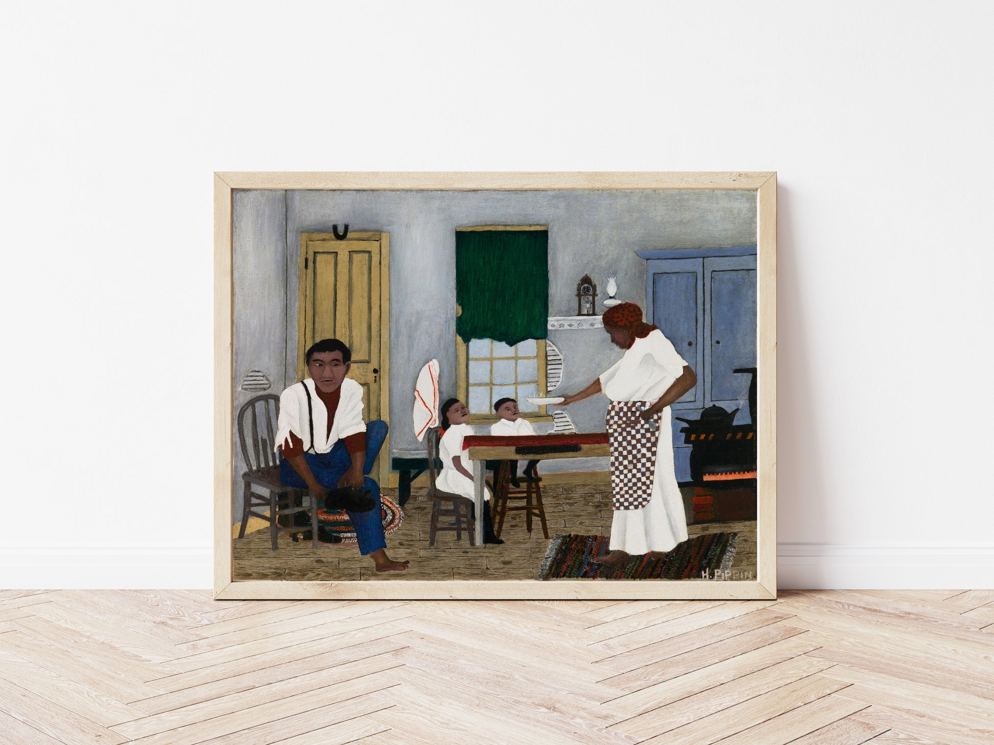 Experience the warmth and familial intimacy encapsulated in Sunday Morning Breakfast by Horace Pippin, a vivid portrayal of domestic life that speaks to the simplicity and beauty of shared moments. The scene is infused with earthy tones and textured brushwork, showcasing a woman lovingly serving breakfast while children eagerly await at the table. Pippin's distinctive style merges folk art with a deep emotional resonance, inviting viewers to appreciate the tenderness of everyday rituals. This piece not only highlights the nurturing spirit of motherhood but also reflects the broader cultural narratives of African American life in the early to mid-20th century. In this enchanting depiction, Pippin's masterful use of color and composition creates a harmonious balance, drawing the eye to the pivotal figures and the inviting space they inhabit. The interplay of light, shadow, and the simple yet impactful details contribute to an overall mood of comfort and joy, making it a perfect addition to any collection celebrating family and heritage.