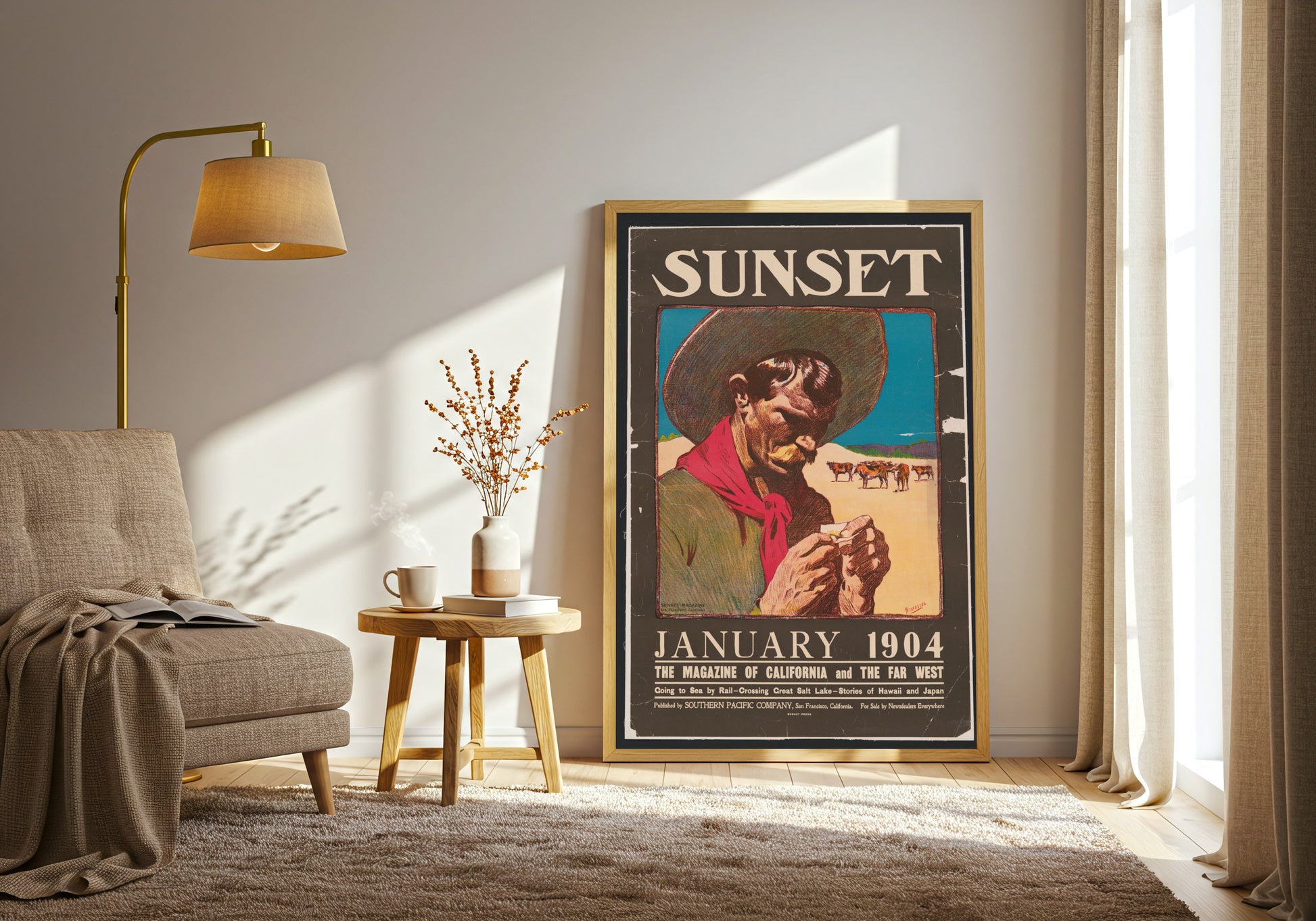The January 1904 cover of Sunset Magazine presents a striking portrayal of a thoughtful cowboy, embodying a sense of both rugged individualism and nostalgia for the American West. With rich colors and bold lines, the artist captures the spirit of the era, inviting viewers to reflect on a time when the West was a landscape of both opportunity and struggle. The composition's warm palette contrasts beautifully with the tranquil backdrop of grazing cattle and rolling hills, evoking a connection to nature and the simplicity of rural life. This print is not just a relic of history; it embodies the enduring allure of Western expansion and the cultural narratives surrounding this pivotal period.