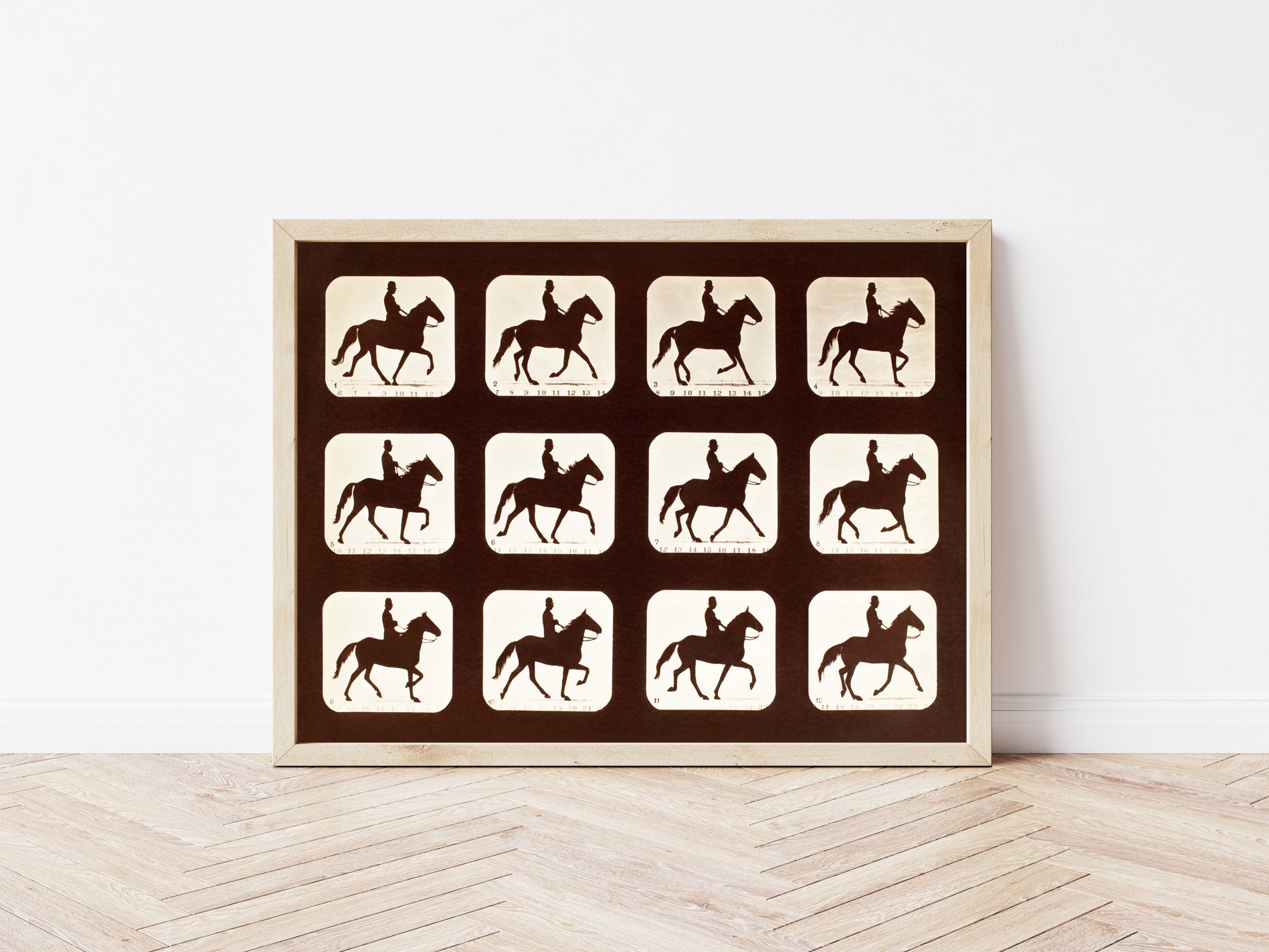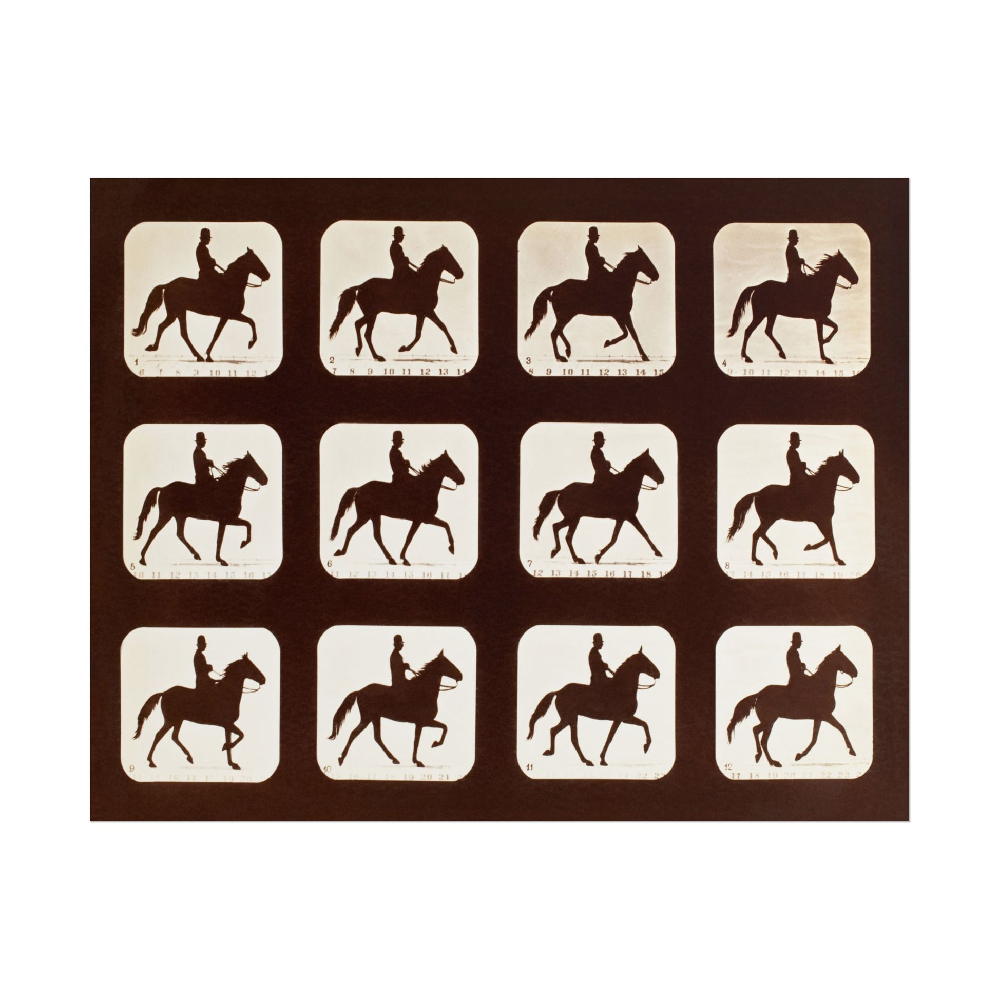 Immerse yourself in the pioneering vision of Eadweard Muybridge with The Amble: One Stride in Eleven Phases, a remarkable study of motion captured through a series of sequential frames. The stark silhouettes of horse and rider glide across a rich, dark background, evoking a sense of rhythm and fluidity. This visual exploration of movement is characteristic of Muybridge's groundbreaking contributions to the understanding of biomechanics in the late 19th century. The artwork not only celebrates the beauty of the equestrian form but also serves as a poignant reminder of the era’s fascination with the mechanics of motion. Beyond its artistic merit, this piece reflects the scientific curiosity of a transforming age, wherein art and technology intersected. Perfect for enthusiasts of photography, motion studies, or equestrian art, this print stands as a historic testament to the evolution of both art and motion analysis, bringing a dynamic energy to any space.