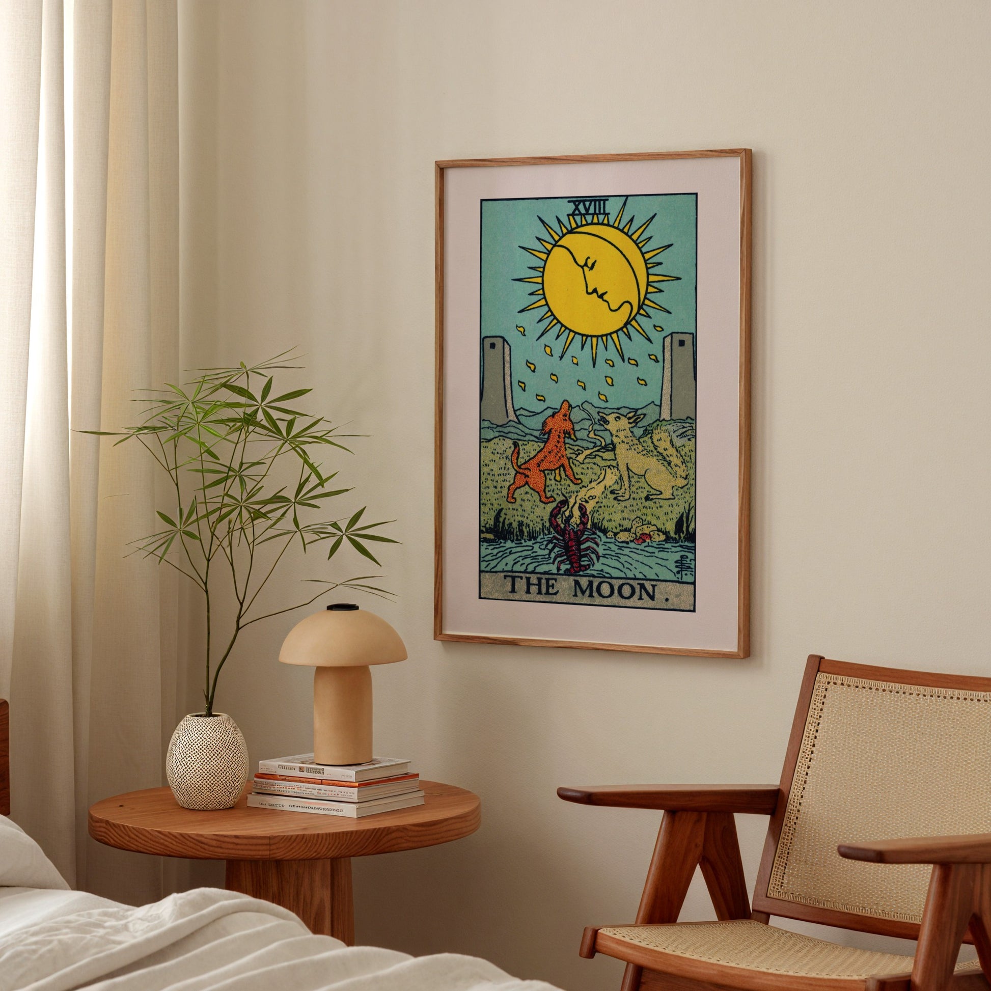 Dive into the mysterious allure of The Moon Tarot card with this enchanting vintage wall art print. A symbol of intuition, dreams, and the subconscious, The Moon evokes the magic of the unseen and the power of inner reflection. Perfect for lovers of witchy art, astrology, and occult symbolism, this mystical art piece brings a hauntingly beautiful presence to any bohemian home decor style.
