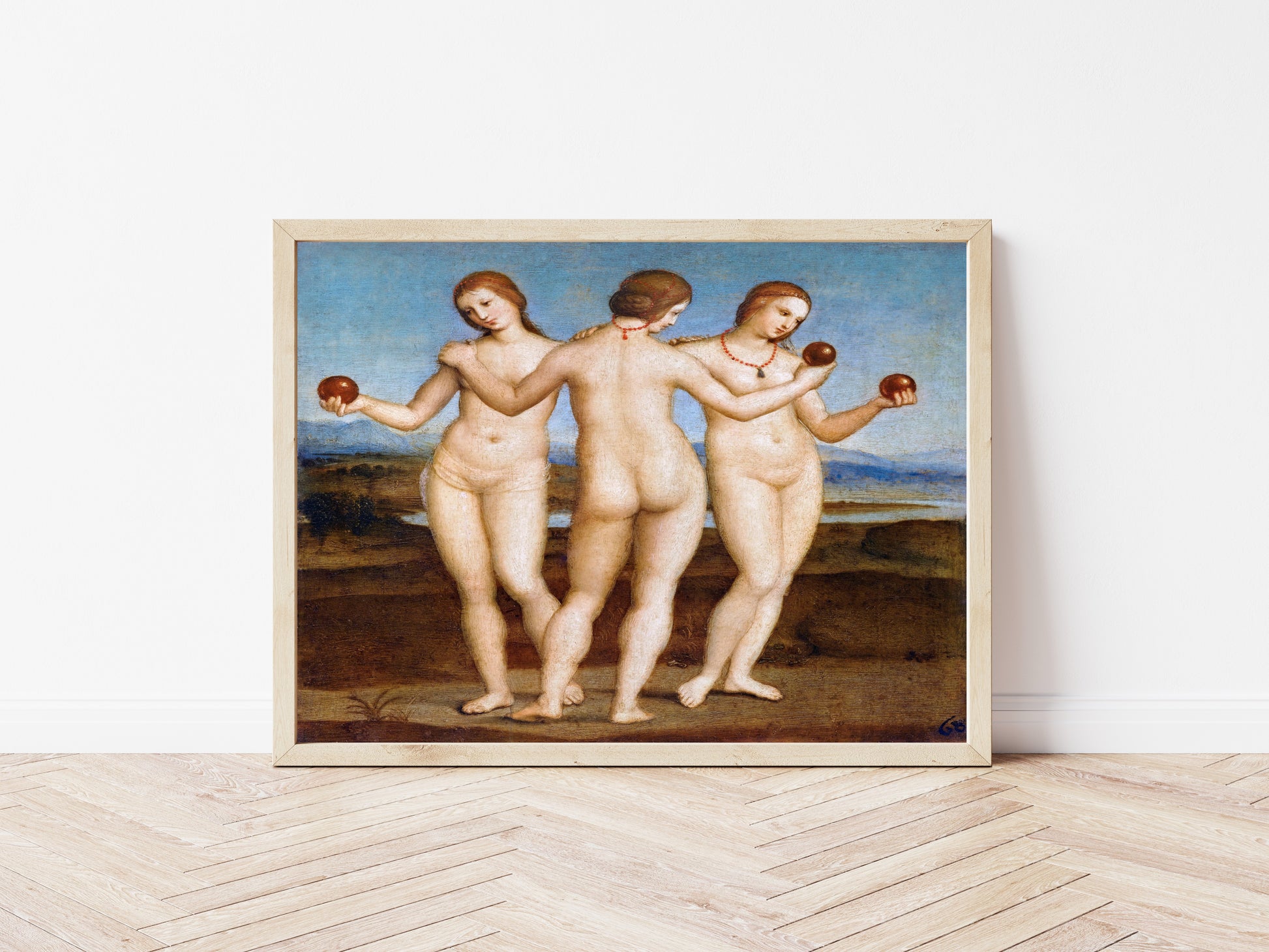 Immerse yourself in the harmonious beauty of The Three Graces by Raphael, a masterful depiction from the High Renaissance period that captures the essence of elegance and femininity. The trio of figures, embodying charm, beauty, and joy, are beautifully rendered with soft, flowing lines and a balanced composition that invokes a sense of serene unity. Draped in delicate, flowing forms, their gentle postures and expressive faces reflect the idealized beauty of classical artistry and the celebration of the human form. Raphael’s rich palette, featuring warm earth tones against a serene blue background, enhances the sense of tranquility and poise, inviting viewers to contemplate the graceful dance of these mythological figures. As an iconic representation of the Renaissance’s humanist ideals, this artwork resonates with themes of love, beauty, and the interconnectedness of life, making it a timeless masterpiece that adds sophistication to any art collection.