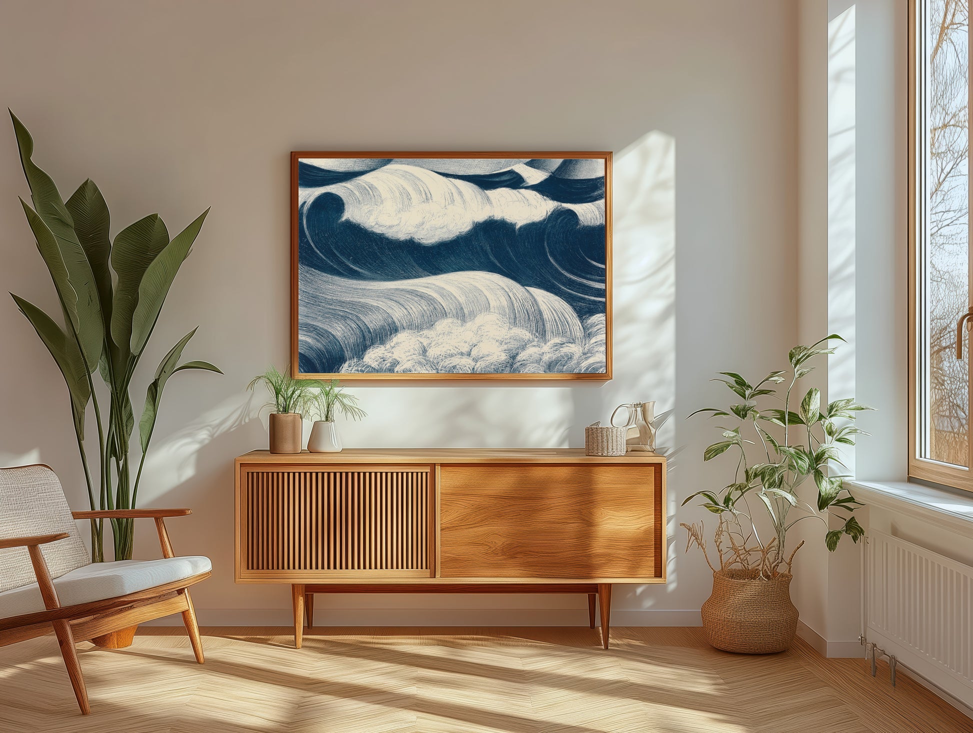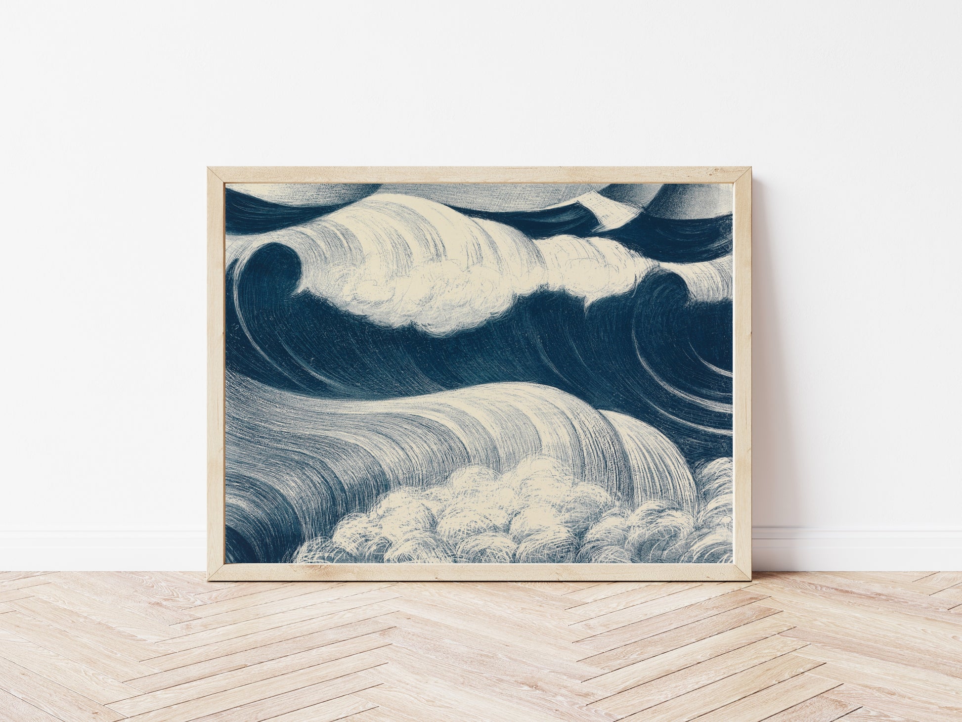 Experience the mesmerizing beauty of The Wave by C. R. W. Nevinson, a remarkable fine art print that encapsulates the dynamic power of the ocean. With undulating forms and contrasting tones of deep navy and soft white, this composition evokes a sense of movement that transports the viewer to the rhythmic pulse of crashing waves. Nevinson's adept use of line captures not just the visual splendor but also the raw emotion inherent in the sea, reflecting a tension that resonates deeply with those captivated by nature's magnificence. This artwork stands as a testament to Nevinson's connection to the Vorticist movement, where bold abstraction meets the tumultuous energy of modern life, crafting a piece that is both timeless and contemporary.