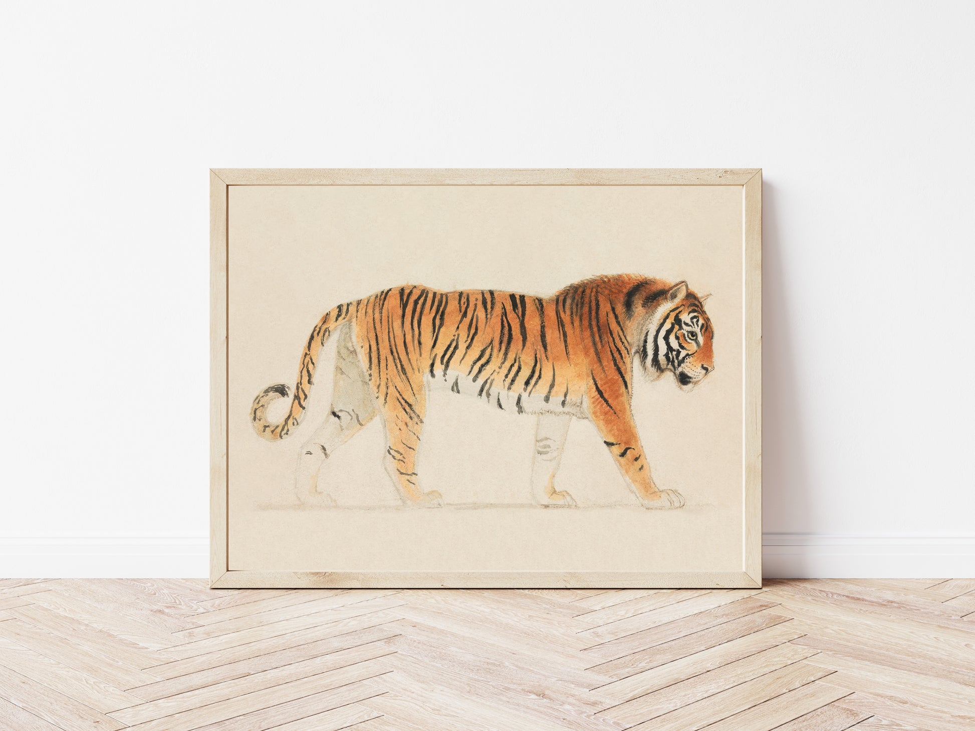 Immerse yourself in the captivating elegance of Tiger in Profile by Thomas Stothard, an exquisite representation of one of nature's most majestic creatures. The artwork showcases the tiger in a poised and serene stance, its striking orange and black stripes rendered with delicate precision, evoking a sense of both power and grace. Stothard's meticulous attention to detail brings this magnificent animal to life, with every contour and shadow thoughtfully articulated to reflect the tiger's inherent strength and beauty. As a notable figure in the early 19th century, Stothard's work often merges the romanticism of nature with an appreciation for wildlife, making this piece a harmonious blend of natural beauty and artistic craftsmanship. Perfect for lovers of wildlife art and fans of classical illustration, this stunning print invites conversation and admiration, making it a striking addition to any art collection or wall display.