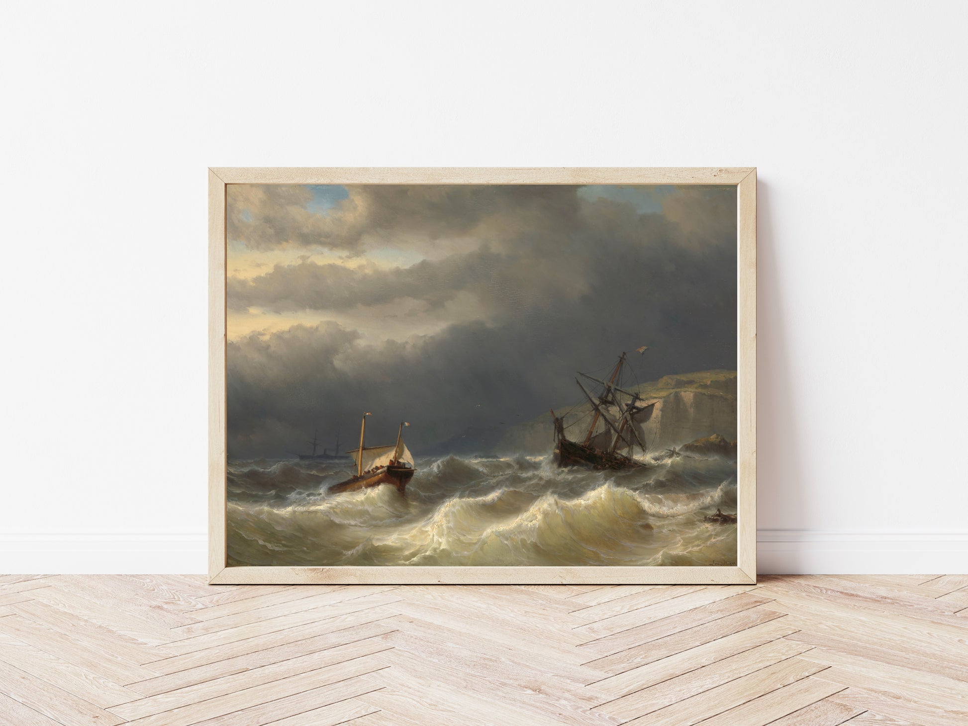 Immerse yourself in the tempestuous beauty of Vintage Marine Seascape by Louis Meijer, a captivating depiction of nautical life that showcases the artist's dynamic command of light and shadow. The turbulent waves, painted in rich hues of blue and gray, contrast strikingly with the atmospheric clouds that herald a storm, creating a sense of both danger and awe. Meijer's ability to capture the raw power of the sea reflects the Romantic movement's fascination with nature's grandeur and unpredictability. The intricate details of the sailing vessels, caught in the throes of the tempest, evoke feelings of adventure and resilience, making this piece a timeless tribute to maritime artistry. This stunning print is perfect for art enthusiasts who appreciate works that encapsulate the allure of the sea. Whether displayed in a living room or study, this seascape transforms any space into a maritime haven where the viewer can almost hear the crashing waves and feel the salty sea breeze. With its dramatic composition and emotional depth, this artwork invites admiration and contemplation.