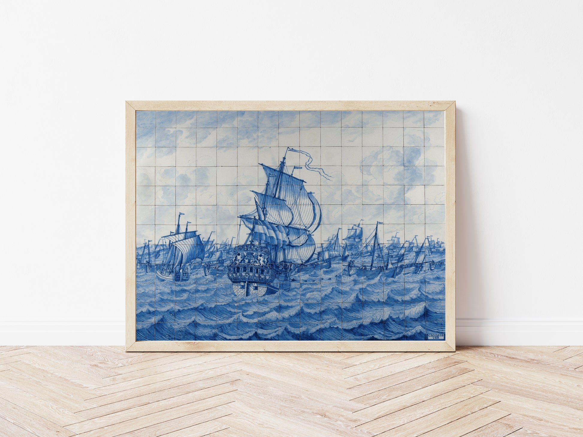 Celebrate the grandeur of maritime history with the Warship Rotterdam Tile Panel, a masterful depiction of naval power etched in stunning blue and white tones. The intricate details of the ships, each billowing sail and wavering flag alive with motion, evoke a sense of adventure and the spirit of seafaring exploration. The composition captures the rhythmic dance of waves, creating a dynamic interplay between the serene sky and the turbulent sea, making it a captivating focal point for any art lover. This artwork stands as a timeless tribute to maritime culture, inviting admiration from enthusiasts of historical and nautical themes.