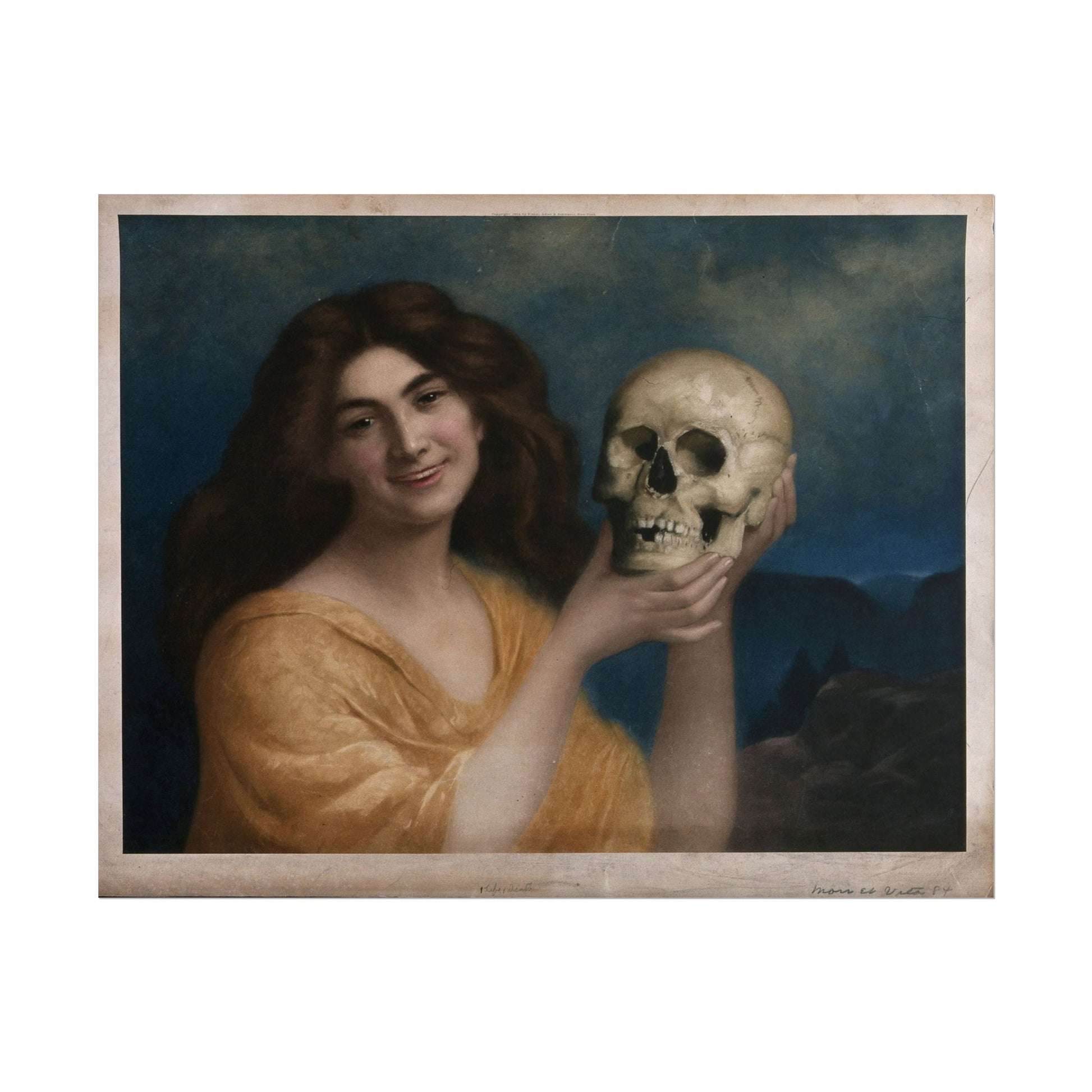 The evocative art piece, Young Woman with Skull, invites viewers to reflect on mortality and beauty through a striking juxtaposition of a serene figure and a skull. The artist's delicate use of color and light imbues the young woman with an ethereal quality, her confident gaze merging the themes of life and death seamlessly. Clad in a soft, flowing garment, her expression conveys both intrigue and a sense of wisdom, highlighting the duality of existence. This work is reminiscent of the Symbolist movement, where depth and emotion are explored through bold imagery and metaphor. A captivating addition to any collection, this print serves as a thought-provoking reminder of the intertwined nature of life and mortality.